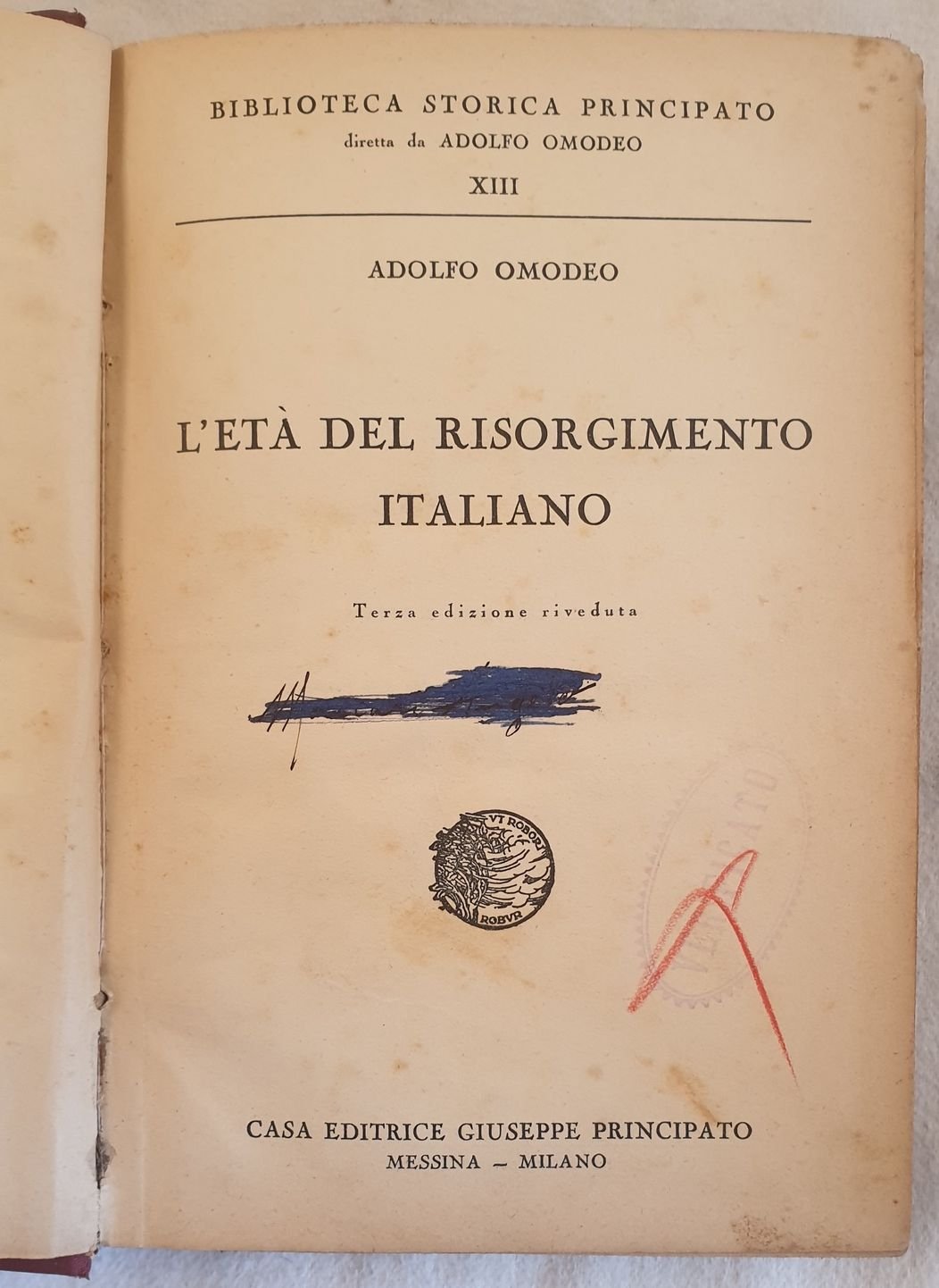 Edizione del 1939 di questo studio sul risorgimento italiano scritto da Adolfo Omodeo. All'interno: equilibrio europeo, antico regime e illuminismo, La politica internazionale dalla guerra dei sette anni alla rivoluzione, l'assemblea costituente, assemblea legislativa, convenzione nazionale, guerre del direttorio, consolato, impero, reataurazione, la rivoluzione di luglio, Giuseppe Mazzini e Vincenzo Gioberti, La rivoluzione europea, il decennio di rpeparazione, il 1859, il 1860, I primi anni del Regno d'Italia Venezia e Roma, La storia europea dal 1870 al 1878, La fine sel sec. XIX e l'inziio del XX, la guerra mondiale ecc. Numerose planches fotografiche all'interno. In buone condizioni. Copertina in tela in discrete condizioni generali con lievi usure ai margini e dorso. Macchie Legatura in buone condizioni. All'interno le pagine si presentano in buone condizioni con fioriture. In 8. Dim. 21x15 cm. Pp. 526+(2). Ediiton of 1939 of this study about iatlian Risorgimento written by Adolfo Omodeo. Different photogrpahic planches inside In good conditions.