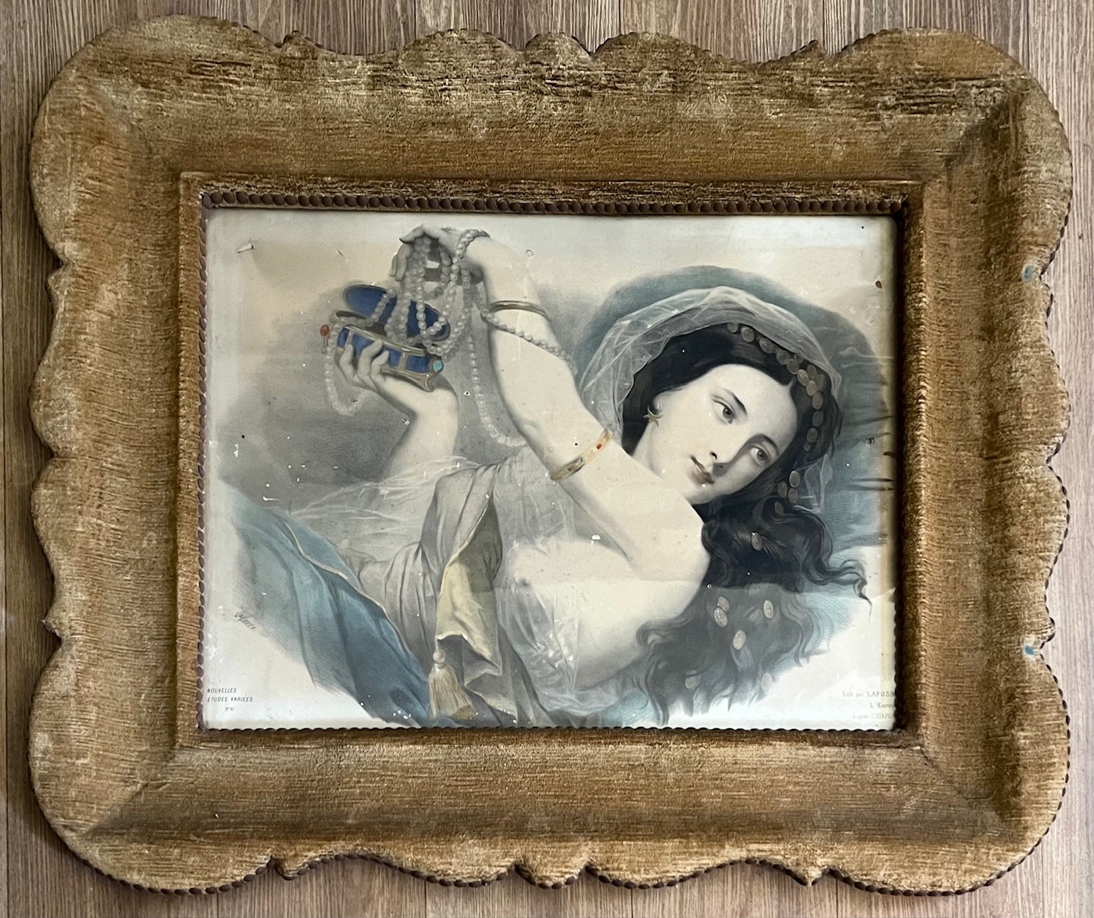 Paris, [Imp. Lith. de Lemercier], [c. 1850], grande litografia con particolari colorati, mm. 470x635. Raffigura una immagine femminile allegorica del continente europeo. Incorniciata in una grande, larga e particolare cornice dal profilo curvilineo, in legno ricoperto da velluto da tappezzeria giallo-dorato. La litografia faceva parte di una serie di immagini raffiguranti i continenti. Con vetro di protezione. Fioriture, bruniture, lievi mancanze. Consunzioni al tessuto della cornice. Misure con la cornice: mm. 770x940.