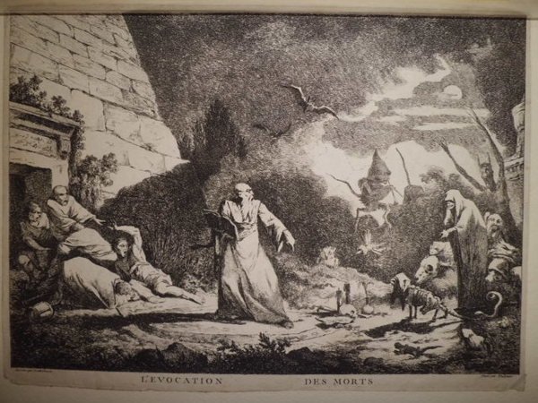 Joseph, Francois Foulquier. Toulose, 1744 - Martinica, 1789. L' evocazione dei morti acquaforte. mm. 225 x 250. Filigrana illeggibile. Buona impressione rifilata all' impronta del rame ma all' esterno della linea marginale, in buono stato di conservazione a parte uno strappettino al margine bianco a sinistra e alcune irregolarità lungo il margine bianco inferiore. Il foglio viene considerato come il meglio riuscito del corpus grafico dell' Artista.