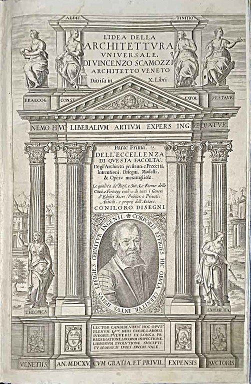 34 cm, in Folio, 2 parti in un volume, rilegatura in pergamena rigida di epoca posteriore, titolo in oro su tassello rosso al dorso, tagli colorati. Due antiporte allegoriche incise su rame con grande cornice architettonica, al centro ritratto dello Scamozzi entro ovale e titoli. Contrariamente a quanto scritto nel titolo, l'opera contiene solo sei libri dell'autore (Parte prima Libri I, II, III; Parte seconda Libri VI, VII e VIII) ciascuno con proprio frontespizio tipografico e marca xilografica dell'autore: Con allegoria che incornicia un ovale con al centro "un camoscio su una rupe assediato da tre cani" e motto: "Sic ad aethera virtus". Parte Prima (Libri I - III) p. (16), 90, 91-193, (2), 194-218, (4), 219-352 (i.e. 356), (32) alcuni errori di numerazione, sono state omesse dal rilegatore due carte bianche che interfogliano, il primo libro ed il secondo libro (p. 90-carta H4) e la fine del terzo libro dall'indice (carta Ll4). Parte Seconda (Libri VI, VII e VIII) p. (12), 1-172, (4), 173-270, (4), 271-370 (i.e. 372), (20), (2) in questo esemplare è presente l'ultima carta che funge da colophon, con l'avviso dello "stampatore a lettori" ed il registro della paginazione con le avvertenze ai rilegatori, questa carta è mancante in molti esemplari in quanto non compare nel registro stesso. Opera completa delle splendide tavole disegnate dall'autore stampate in xilografia ed incise su rame a piena e doppia pagina . Macchiolina di inchiostro antico alle p. 337 e 338 della prima parte, alle p. 99 e 100 della seconda parte macchia marginale di inchiostro e forellino di pochi millimetri con perdita di due lettere. Al netto dei pochi difetti qui descritti si tratta di un esemplare assai ben conservato.