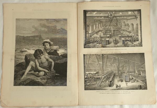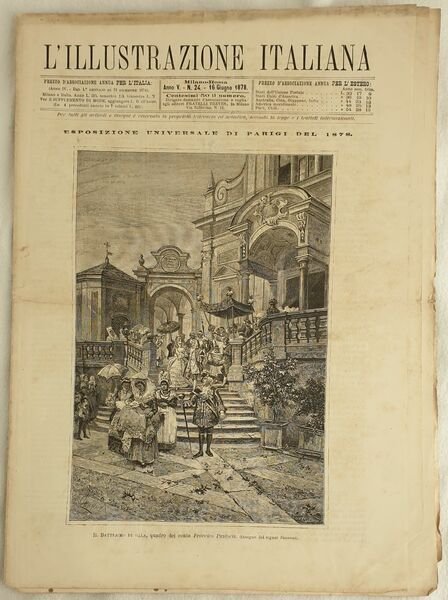 Numero del 16 giugno 1878 dell'Illustrazione italiana. Il volume in folio è riccamente illustrato da incisioni nel testo e fuori testo. All'interno: L'Esposizione Universale, I due attentati all'Imperatore Guglielmo, Mercellina, Esposizione annua di belle arti a Torino, Victor Hugo ed Ernesto Renan, Tranquillo Cremona, La vita di Vittorio Emanuele del Massari Le incisioni: H. M. Stanley, Attentato contro l'Imperatore Guglielmo, Napoli la spiaggia di Mergellina, Interno della sezione italiana, Sulla riva del mare, Veduta dell'interno di una fabbrica di zucchero di canna ecc. In buone condizioni. Copertina editoriale in buone condizioni con lievi usure ai margini e dorso. Legatura editorialmente assente. Pagine in buone condizioni con fioriture. Piegatura orizzontale. In folio cm 38,5x28,5. Pp. da 385 a 400 Number of 16th of june 1878 of Illustrazione italiana. The volume in folio is richly illustrated by engravings in the text and out of text. Inside: Universal Exposition, Two murder attempt to the Empeeror Guglielmo, Mercellina, Exposition of Beautiful Arts in Turin, Victor Hugo andd Ernesto Renan, Tranquillo Cremona, the life of Vittorio Emanuele del Massari The prints: H. M. Stanley, Murder attempt against Emperor Guglielmo, Napoli the river of Mergellina, Interior of italian section, On the sea river, View of the interior of a cane sugar firm ecc. In good conditions.Editorial cover in good conditions slightly won in the extremities. Binding editoriarly lacks. Pages are in good conditions with foxing. Horizontal folding. In folio cm 38,5x27,5. Pp. da 385 a 400
