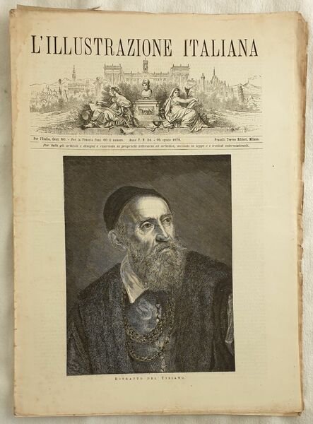 Numero del 25 agosto 1878 dell'Illustrazione italiana. Il volume in folio è riccamente illustrato da incisioni nel testo e fuori testo. All'interno: Tiziano e il suo centenario, I bagni nel Tevere, Ricordi di PArigi di E. De Amicis, Maioliche ferniani, I Reali d'Italia a Venezia , Il Cardinal Nina, Il Generale Philippovich, L'entrata dell'Arcivescovo di Napoli Le incisioni: Ritratto del Tiziano, Maioliche della fabbrica ferniani, Le feste di Venezia, Il Pont Neuf di Parigi, Dalle novelle di Edmondo de Amicis ecc. In buone condizioni. Copertina editoriale in buone condizioni con lievi usure ai margini e dorso. Legatura editorialmente assente. Pagine in buone condizioni con fioriture. Piegatura orizzontale. In folio cm 38,5x28,5. Pp. da 113 a 128. Number of 25th of august 1878 of Illustrazione italiana. The volume in folio is richly illustrated by engravings in the text and out of text. Inside: Tiziano and hundred years, baths in Tevere, Rememberings of Paris by E. De Amicis, Maioliche ferniani, Italian royals in Venice, Il Cardinal Nina, General Philippovich, Entry of Archybyshop of Naples The prints: Ritratto del Tiziano, Maioliche della fabbrica ferniani, Le feste di Venezia, Il Pont Neuf di Parigi, Dalle novelle di Edmondo de Amicis ecc. In good conditions. Editorial cover in good conditions lightly won in the extremities. Binding editoriarly lacks. Pages are in good conditions with foxing. Horizontal folding. In folio cm 38,5x27,5. Pp. da 113 a 128