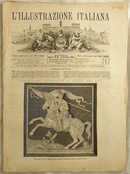 Numero del 1 settembre 1878 dell'Illustrazione italiana. Il volume in folio è riccamente illustrato da incisioni nel testo e fuori testo. All'interno: Sul monumento a Tiziano, Parigi e l'esposizione lettere di Giuseppe Giacosa, Le feste di Venezia per i sovrani, Serraglio di bestie fossili Le incisioni: Giovanna D'Arco, Napoli Abate San Felice nel Duomo, La fontana giapponese, Esposizione universale di Parigi del 1878, Le feste di Venezia al Lido, L'idillio classico estivo ecc. In buone condizioni. Copertina editoriale in buone condizioni con lievi usure ai margini e dorso. Legatura editorialmente assente. Pagine in buone condizioni con fioriture. Piegatura orizzontale. In folio cm 38,5x28,5. Pp. da 129 a 144. Number of 1st of september 1878 of Illustrazione italiana. The volume in folio is richly illustrated by engravings in the text and out of text. Inside: About the monument to Tiziano, Paris and the exposition letters of Giuseppe Giacosa, Feasts of Venice for soverains, Serraglio di bestie fossili The prints: Giovanna D'Arco, Naples Abate San Felice nel Duomo, Japanese fontain, Esposizione universale of Paris of 1878, Feasts of Venice in Lido, L'idillio classico estivo ecc. In good conditions. Editorial cover in good conditions lightly won in the extremities. Binding editoriarly lacks. Pages are in good conditions with foxing. Horizontal folding. In folio cm 38,5x27,5. Pp. da 129 a 144
