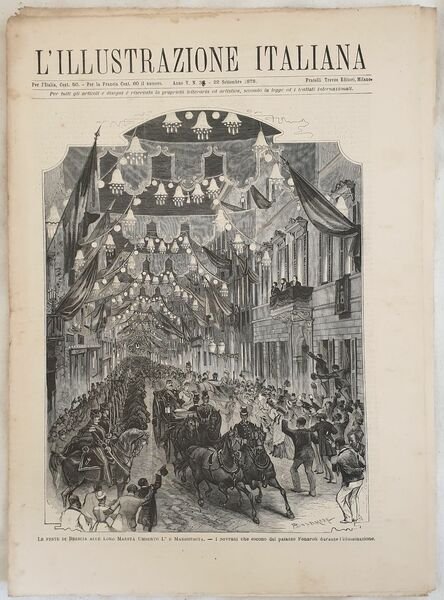 Numero del 22 settembre 1878 dell'Illustrazione italiana. Il volume in folio è riccamente illustrato da incisioni nel testo e fuori testo. All'interno: In viaggio per la Bosnia: Sava, Reali d'Italia a Brescia, Le feste di Mantova, I fondaci di Napoli, Il viaggio di Cameron nell'Africa, Hadgi Loja ecc. Le incisioni: le feste di Brescia, I chioschi cinesi, Le feste di Mantova per l'arrivo delle loro Maestà, I fondaci di Napoli, viaggion in Cameron ecc. In buone condizioni. Copertina editoriale in buone condizioni con lievi usure ai margini e dorso. Legatura editorialmente assente. Pagine in buone condizioni con fioriture. Piegatura orizzontale. In folio cm 38,5x28,5. Pp. da 177 a 192 Number of 22nd of september 1878 of Illustrazione italiana The volume in folio is richly illustrated by engravings in the text and out of text. Inside: In travel to Bosnia: Sava, Royal people in Brescia, the feasts of Mantova, Naples, travel of Cameron to Africa, Hadgi Loja The prints: feasts of Brescia, Feasts of Mantova for the arriuval of their majesty, I Naples, travel in Cameron ecc. In good conditions. Editorial cover in good conditions slightly won in the extremities. Binding editoriarly lacks. Pages are in good conditions with foxing. Horizontal folding. In folio cm 38,5x28,5. Pp. da 177 a 192<BR><BR>