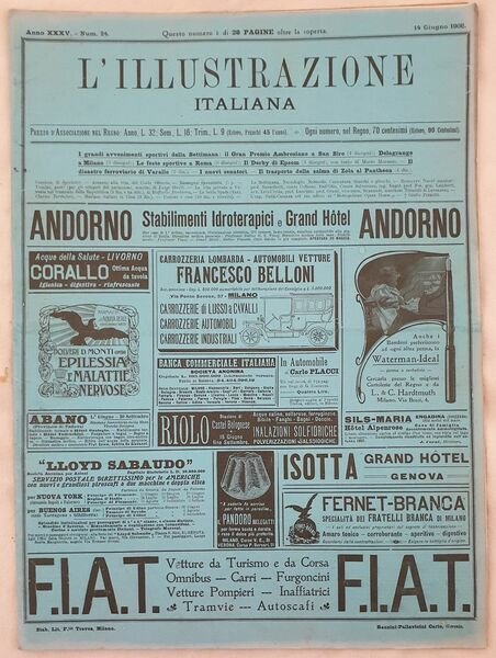 Numero del 14 giugno 1908 dell'Illustrazione italiana.<BR><BR>Il volume in folio è riccamente illustrato da incisioni nel testo e fuori testo.<BR><BR>All'interno: La vittoria italiana al Derby di Epsom, La salma di Zola al Pantheon, Le feste sportive di Roma, Leone Delagrange a Milano, Il Gran Premio Ambrosiano a San Siro, Il disastro ferroviario di Roccapietra presso Varallo, I nuovi uffici postali italiani in Turchia, I marinai italiani in Cina ecc.<BR><BR>In buone condizioni.<BR><BR>Copertina editoriale in buone condizioni con lievi usure ai margini e dorso. Legatura editorialmente assente. Pagine in buone condizioni con fioriture. Piegatura orizzontale. In folio cm 41x30. Pp. da 557 a 584.