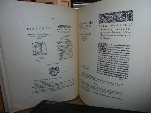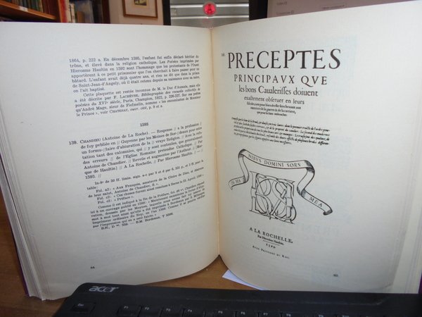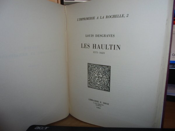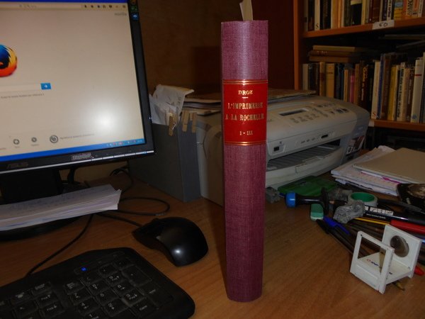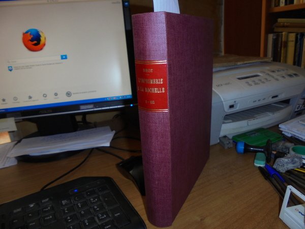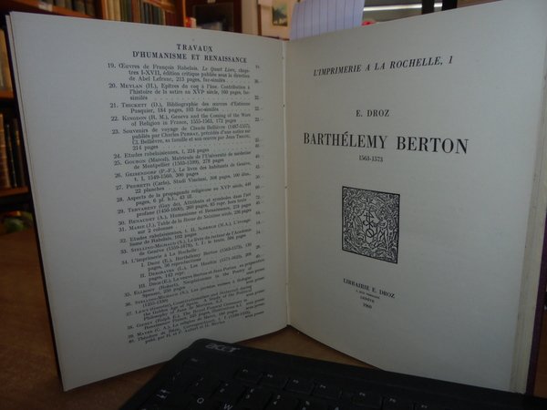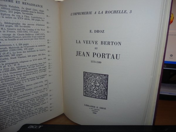 E. DROZ. L' Imprimerie a la Rochelle 1.2.3. Barthélemy Berton 1563 -1573. Genève, Librairie E. Droz, 1960. 3 parti in un volume in-8° grande, tela con titolo in oro entro tassello al dorso. La tipografia di La Rochelle, 1. Barthélemy Berton 1563-1573. Droz, Ginevra, 1960. 139 pagg. Prima edizione. 2 DESGRAVES (Louis). La tipografia di La Rochelle, 2. Les Haultins 1571 -1623. Droz, Ginevra, 1960. 168 pagg., (1) p. Prima edizione. 3. DROZ (Eugénie). La tipografia di La Rochelle, 3. La veuve Berton e Jean Portau 1573-1589. Droz, Ginevra, 1960. 126 pagg. Prima edizione. Queste tre opere ripercorrono le carriere di questi tipografi, di cui abbiamo pochi documenti, e ne elencano le produzioni. Ma ci portano molte altre cose oltre agli annali della stampa a La Rochelle: un contributo importantissimo e preciso alla storia politica e religiosa della Francia, per un tempo in cui la città era la capitale della Protestantesimo francese. Numerosissime le riproduzioni di pagine di titoli, personaggi e ornamenti tipografici. Indice copioso (soprattutto l'indice delle biblioteche in cui si trovano queste edizioni di La Rochelle). Perfetto stato di conservazione in legatura recente con le copertine originali conservate. Uff. E - I - 6 - 2
