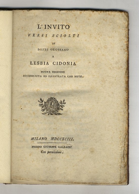 L'invito. Versi sciolti di Dafni Orobiano a Lesbia Cidonia. Nuova edizione accresciuta ed illustrata con note.