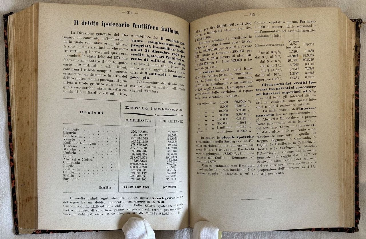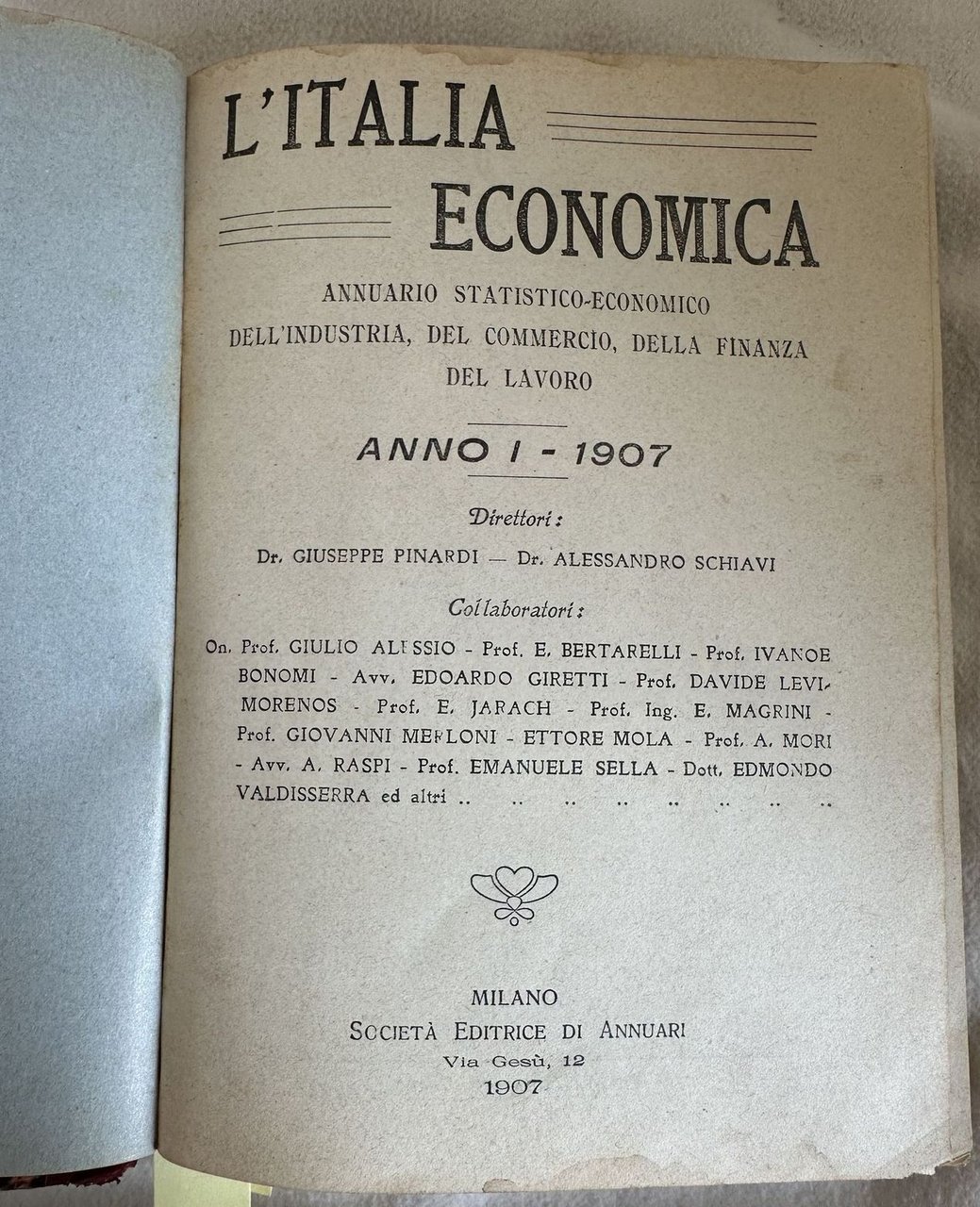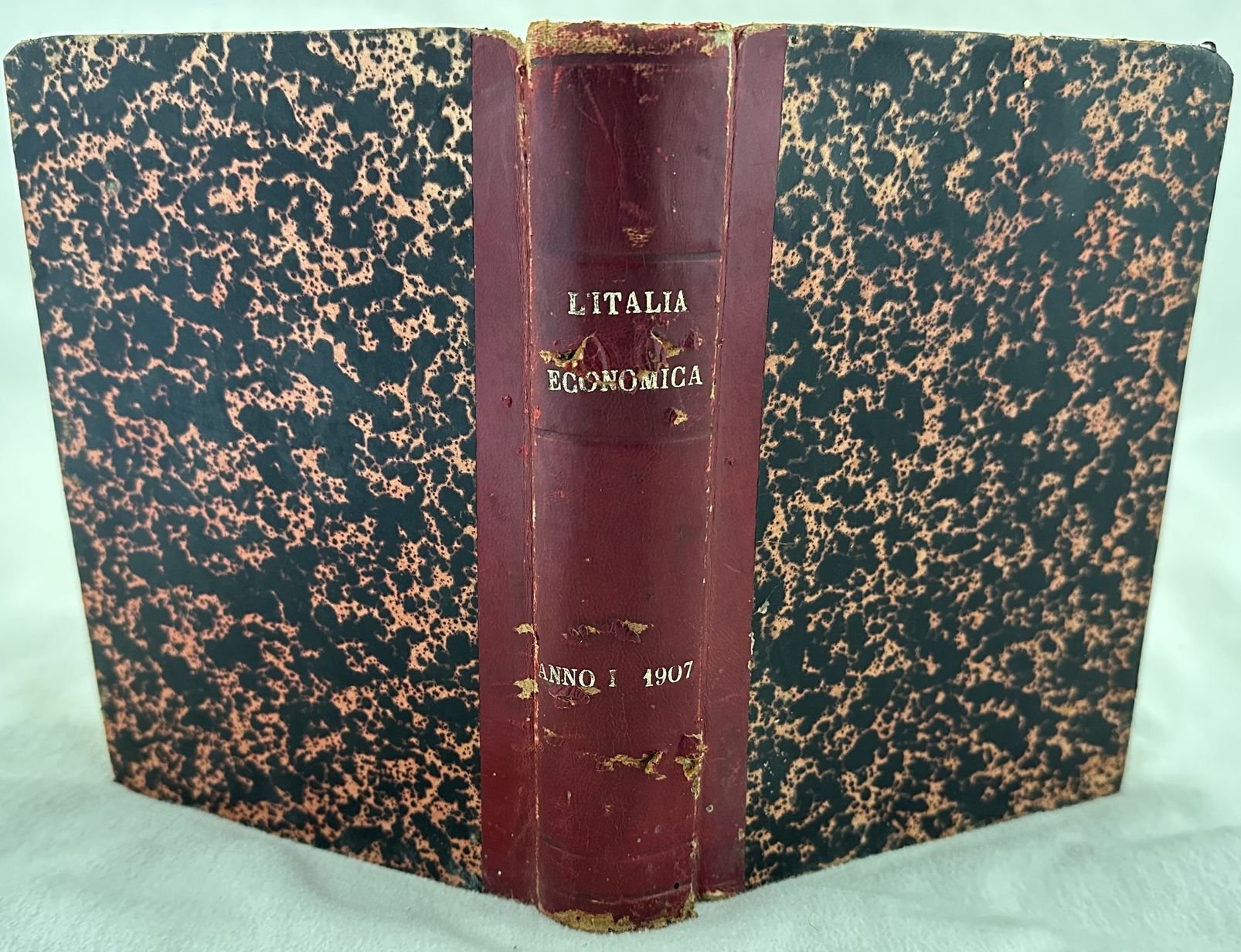 Edizione del 1907 di questo annuario statistico economico dell'industria, del commercio, della finanza, del lavoro a cura di Giuseppe Pinardi e Alessandro Schiavi. All'interno: L'Italia fisica, la popolazione, l'agricoltura, industria, commercio, ricchezza dell'Italia (finanze pubbliche, monopoli dello Stato, lotto tabacchi), Risparmio e credito, lavoro, consumi, morbie morte, criminalità, istruzione, previdenza, Italia politica, Diagrammi (sviluppo dell'industria della seta in Italia, industria del cotone, dello zucchero, produzione mineraria e metallurgica, Consumi annui per abitante in Italia, Salari e prezzi del grano, Natalità mortalità nuzialità ecc. In buone condizioni. Copertina in mezza pelle con titolo e decorazioni in oro al dorso in discrete condizioni con lievi usure marginali. Legatura in buone condizioni. Pagine in buone condizioni con rare fioriture. In 16. 18,5x14 cm. Pp. XII+532+(24).Edition of 1907 of this economical statistics yearbook of industry, trade, finance, work by Giuseppe Pinardi and Alessandro Schiavi. In good conditions. Half leather coeval cover with gilted title andd decorations in fair conditions lgihtly worn in the extremities. Binding in good conditions. Inside pages are in good conditions with occasional foxing. In 16. 18,5x14 cm. Pp. XII+532+(24).