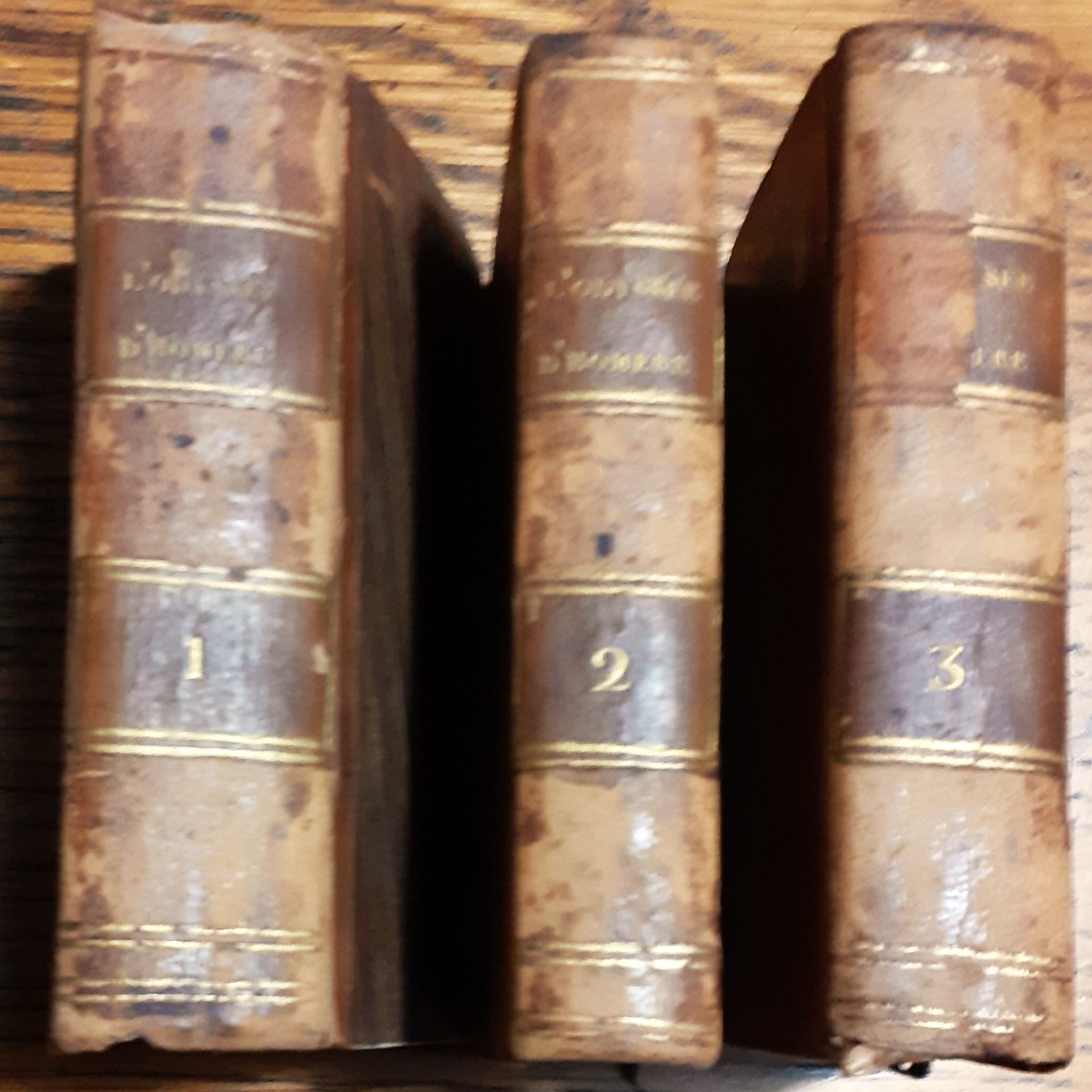 Opera in tre tomi. Testo in francese. H 10,5 cm ca.; tomo 1^: pp. clxxii (Préface)+296; tomo 2^: pp. 320; tomo 3^: pp. 292+pp. descrittive delle tavole illustrate; cart. con dorso in pelle, segnalibro in stoffa verde. Con tavole illustrate in nero f. t. Stato mediocre (alcune fioriture, uno strappo all'angolo inferiore destro di p. 1 del tomo 1^) e parte della scritta sul dorso del tomo 3^ mancante.