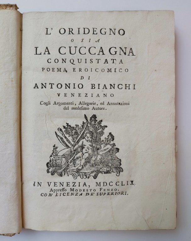 L’ORIDEGNO o sia la Cuccagna conquistata. Poema eroicomico di. Veneziano. Cogli argomenti, allegorie, ed annotazioni del medesimo autore.