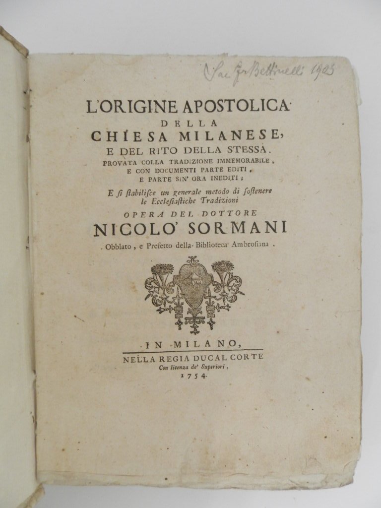 L'origine apostolica della Chiesa milanese, e del rito della stessa. Provata colla tradizione immemorabile, e con documenti parte editi, e parte sin'ora inediti; e si stabilisce un generale metodo di sostenere le ecclesiastiche tradizioni
