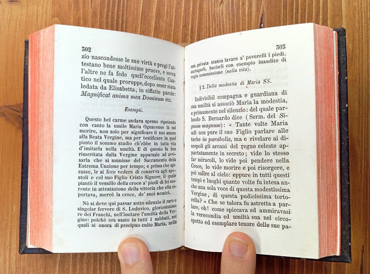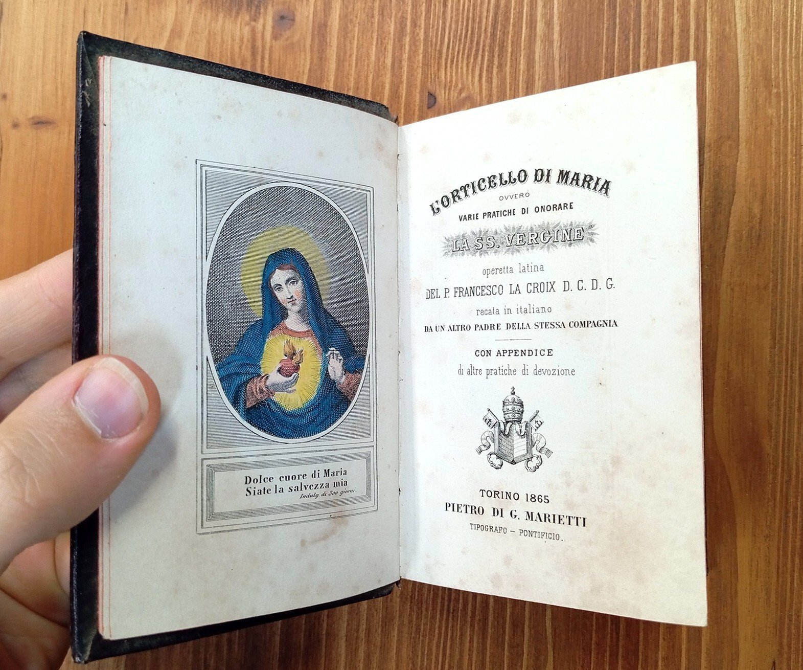 "Operetta latina del P. Francesco La Croix recata in italiano da un altro padre della stessa compagnia, con appendice di altre pratiche di devozione". Prima e unica edizione italiana - Volume rilegato in piena pelle con titoli, cornici e sigla in oro al piatto e al dorso, tagli dipinti in arancione, 511 pagine impreziosite da una stampina a colori in antiporta ed altre in nero all'interno. Esemplare in ottimo stato di conservazione, paginazione candida e compatta, legature ben salde. Fascinoso e raro volumetto devozionale ottocentesco incentrato sul culto mariano, con numerosi esercizi di riverenza e meditazione.