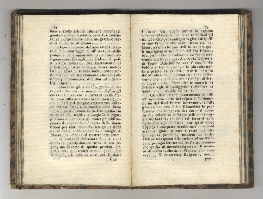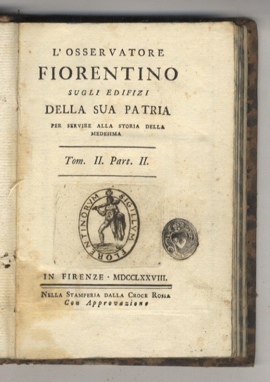 Firenze, Nella Stamperia dalla Croce Rossa, 1778, un volume in-8, cartonatura "radicata" coeva, tagli "spugnati", pp. 185, [1]. Con vignetta incisa in rame sul frontespizio (“Sigillum Florentinorum) tre tavole ripiegate e illustrazioni calcografiche n.t.: a pagina 3 Genealogia Casa Medici (tavola ripiegata), a pagina 3 testata con ritratti di esponenti della famiglia Medici, a pagina 31 mausoleo Giovanni de' Medici (tavola ripiegata), a pagina 118 Savonarola (tavola), a pagina 142 Fauno di Michelangelo. Si tratta della sola seconda parte del tomo II. Prima edizione. Moreni, I. 508 - Inghirami. 378 - Bigazzi. 12931.