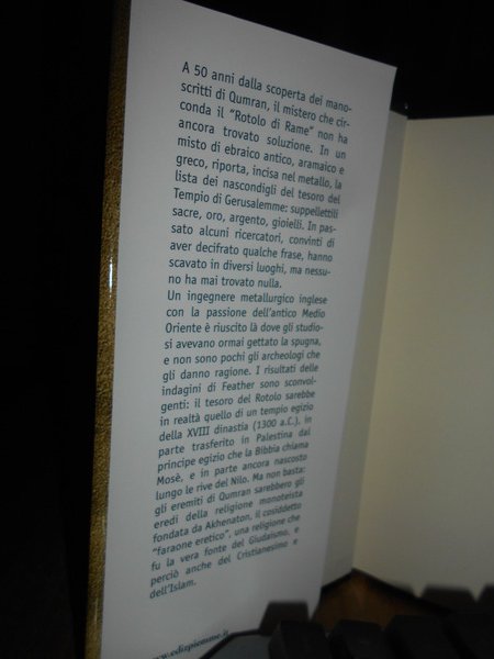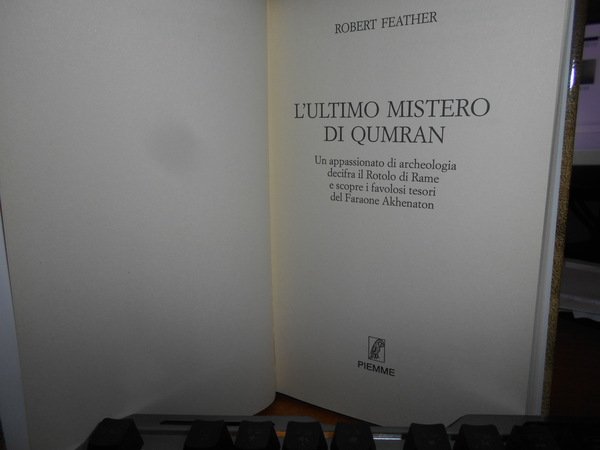 ROBERT FEATHER. Casale Monferrato, Piemme, 2000. L' ultimo mistero di QUMRAN. In-8°, cartonato edit. con sovracopertina ill. a col. 448 pp. con alcune illustrazioni n.t. e 16 tavole a colori f.t. Come nuovo. Uff. stanzetta mob. a destra