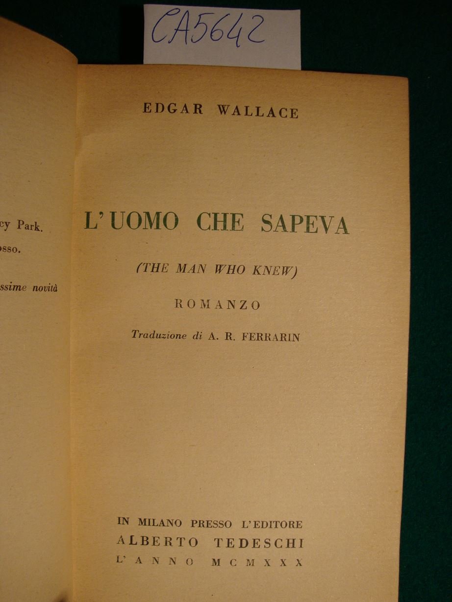 Vol. della collana di romanzi - gialli di Edgar Wallace. Titolo dell'opera originale - The man who knew - - DETTAGLIO DELLE CONDIZIONI : Segni d'uso in coperta con minute macchie e minute fioriture. Marginali fioriture alle pagg. che non ledono la leggibilità del testo - .