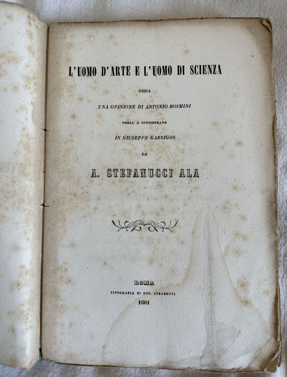 Edizione del 1861 di questa interessante opera sull'uomo d'arte scritto da Stefanucci Ala. Opinione di Antonio Rosmini presa a considerare in Giuseppe Garrigos. In buone condizioni. Copertina editoriale con dorso coperto da carta in buone condizioni con lievi usure ai margini e dorso. Legatura in buone condizioni. All'interno le pagine si presentano in buone condizioni con fioriture. In 8. 22,5x15 cm. Pp. 149+(3).Edition of 1861 of this interesting work about man of art written by Stefanucci Ala. Opinion of Antonio Rosmini considered in Giuseppe Garrigos. In good conditions. Editorial cover in good conditions lightly worn in the extremities. Spine covered by paper. Binding in good conditions. Inside pages are in good conditions with foxing.In 8. 22,5x15 cm. Pp. 149+(3).