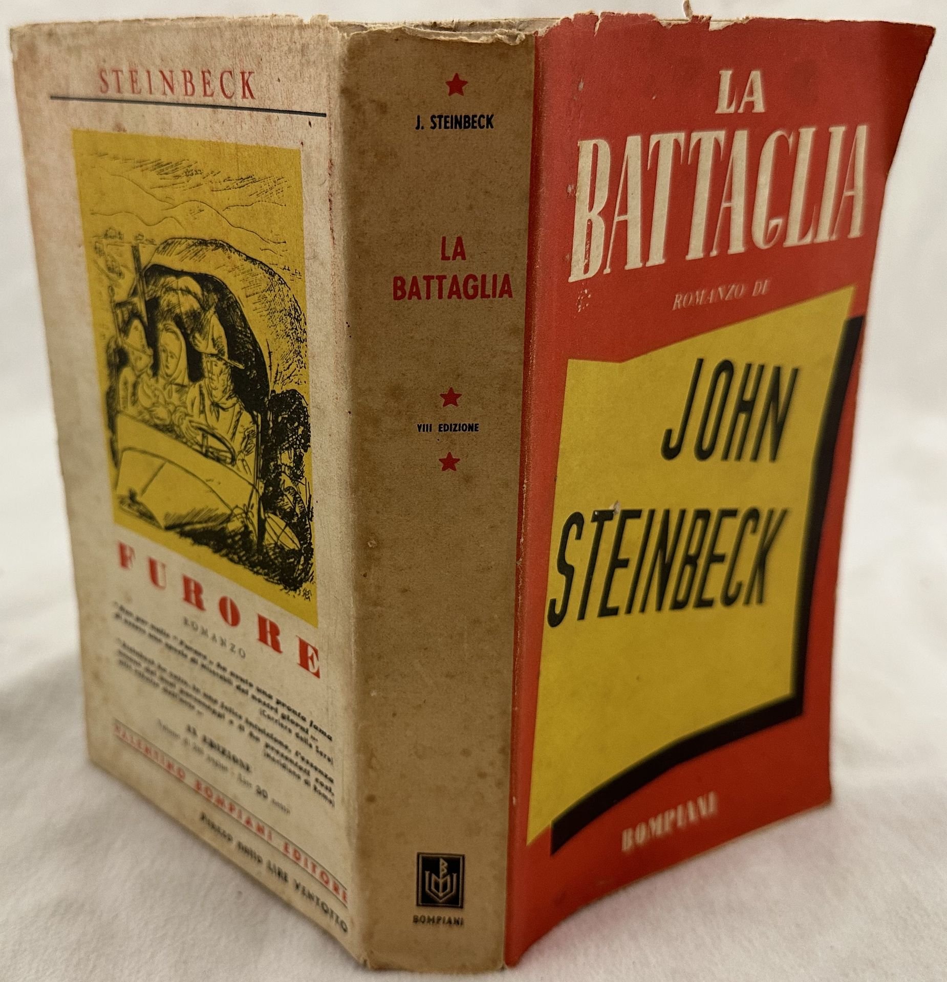 Edizione del 1942 di questo romanzo dello scrittore americano John Steinbeck (1902-1968) "La battaglia". Titolo originale dell'opera "In dubious battle" In buone condizioni. Copertina editoriale con sovraccoperta in buone condizioni con lievi usure marginali. Legatura in buone condizioni. Pagine in buone condizioni con rare fioriture. In 8. cm 20,5+12. Pp. VII+(1)+404+(8).Edition of 1942 of this novel by the american writer John Steinbeck (1902-1968) "La battaglia". Original title "In dubious battle" In good conditions. Editorial cover with dustjacket in good conditions lightly worn in the extremities. Binding in good conditions. Pages in good conditions with occasional foxing. In 8. cm 20,5+12. Pp. VII+(1)+404+(8).