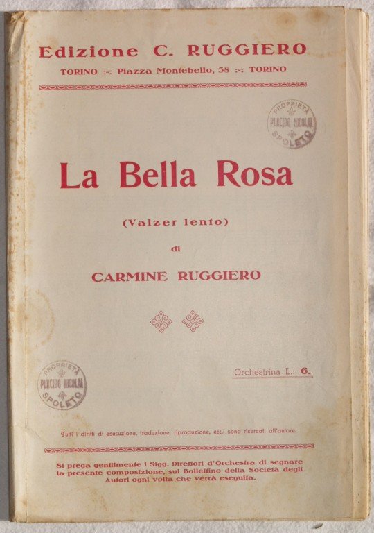 In 8. cm 26x18. Pp. 14. partitura completa per orchestra senza data ma degli anni '20 di una canzone. Caratteristica copertina illustrata d'epoca. Ex libris in copertina. In buone condizioni, margini usurati. a complete score for orchestra of 1920's. Carachteristic decorated cover of that period. Ex libris in the cover. In good conditions, wearings.