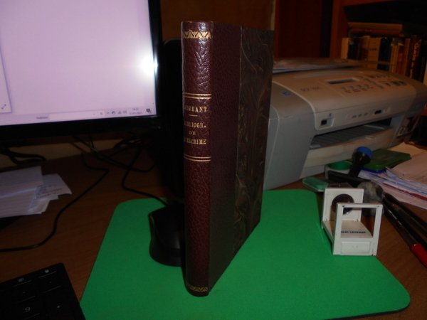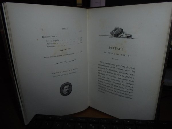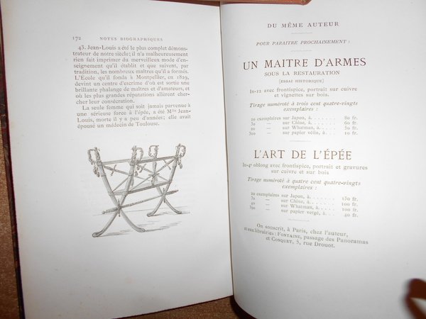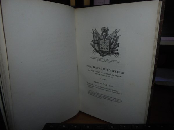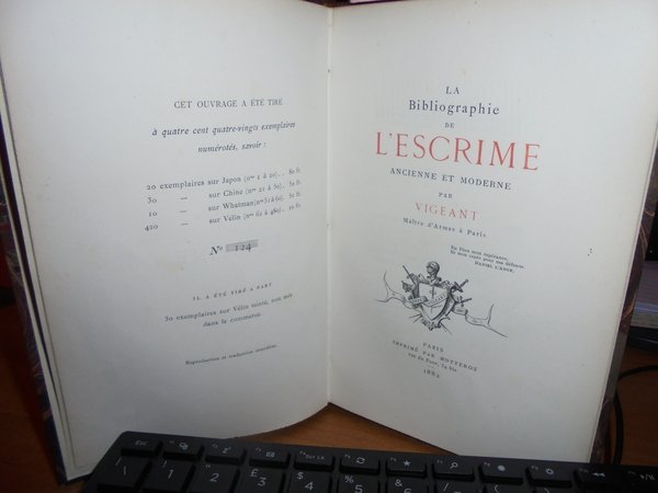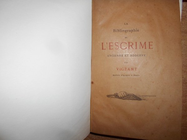 par VIGEANT. Paris, Imprimé par Motteroz, 1882. La Bibliographie de L' Escrime Ancienne et Moderne. In-16° grande, m. marocchino con titolo in oro sul dorso, copertine originali in carta pergamena conservate. 172, (1) pp. Stupendo esemplare in legatura di pregio con le copertine originali conservate. Uff. F - 6