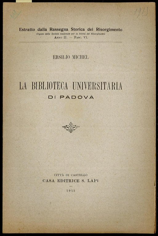 Opuscolo vintage. Estratto dalla Rassegna Storica del Risorgimento Organo della Società nazionale per la Storia del Risorgimento ANNO II. — FASC. VI. Ordinario segno del tempo.