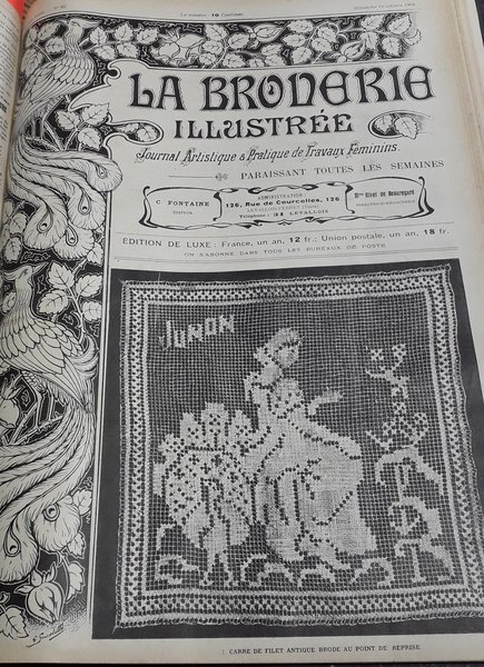 La Broderie Illustrée - Journal artistique et pratique de travaux féminins, 7e année, n°42 (16 octobre 1904) : Carré de filet antique brodé au point de reprise / Cadre Louis XVI pour carte-album / Feston pour tapis / Elégant porte-montre, style Louis XVI