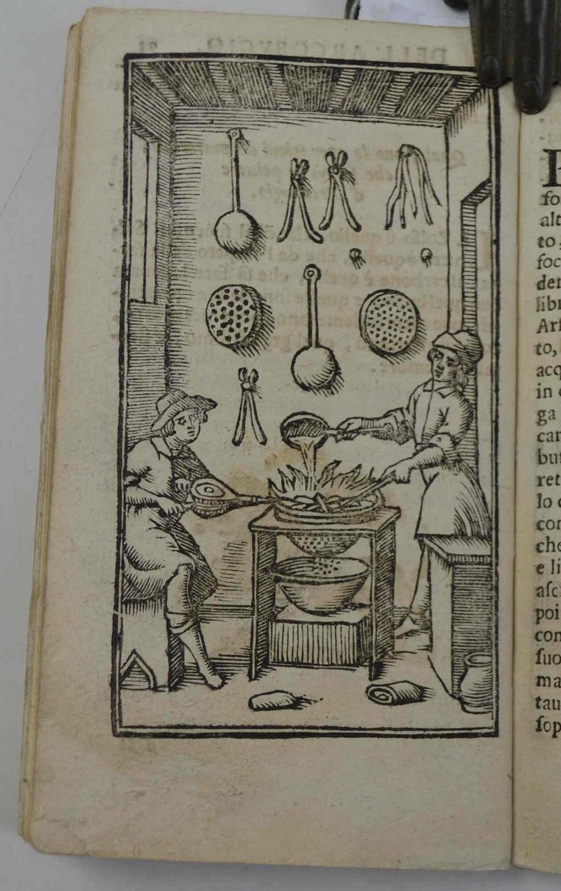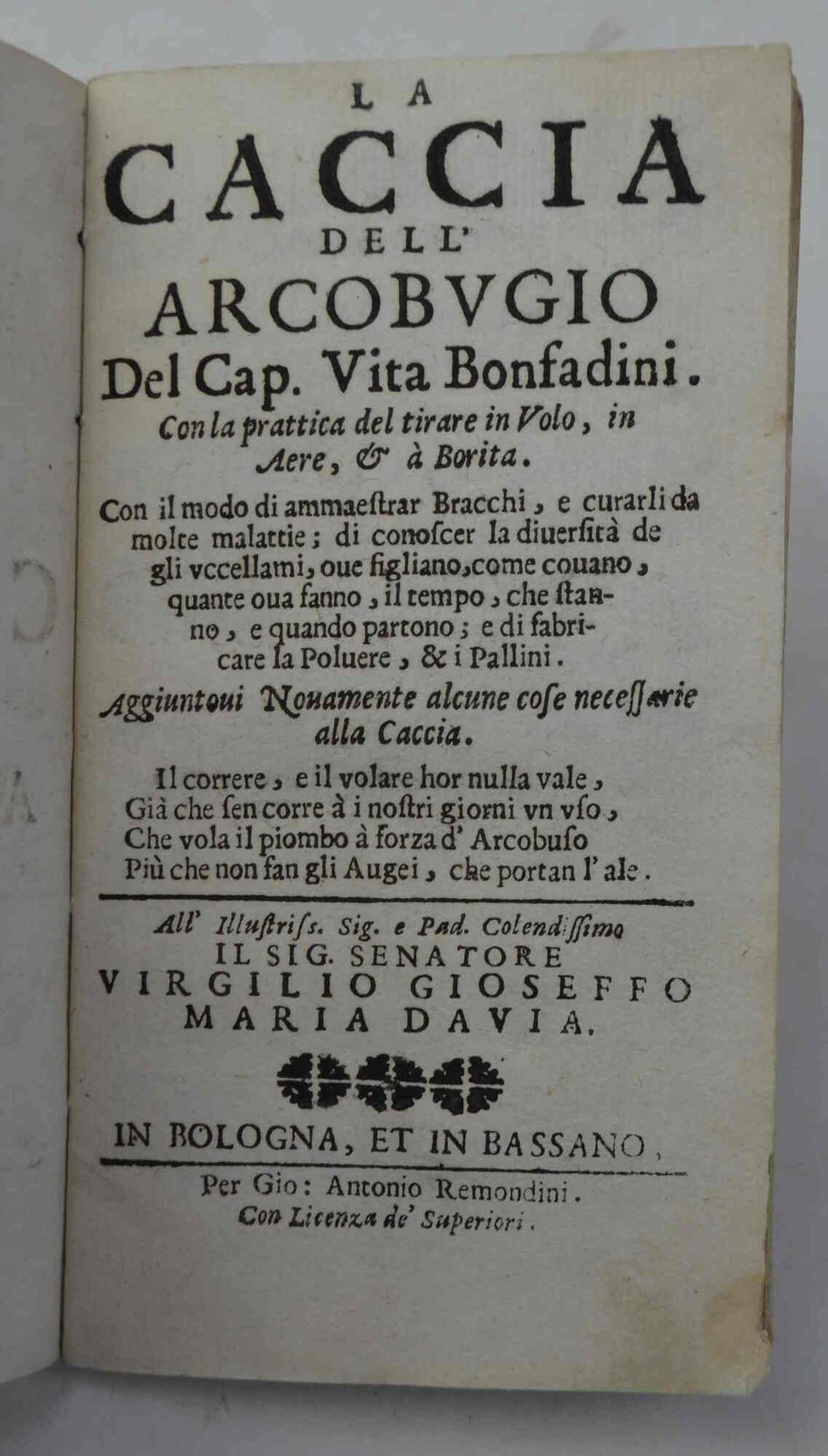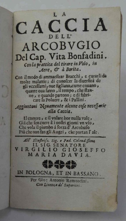 Cm. 14,5, pp. 96. Con 4 belle figure incise a piena pagina in xilografia. Legatura coeva in cart. d'attesa. Esemplare genuino e ben conservato. Edizione elencata da Ceresoli di una delle prime opere sulla caccia col fucile (p. 104): "Il contenuto è importante per la descrizione dell'archibugio, per la tecnica del tiro alla selvaggina in volo o in corsa, per l'addestramento del bracco alla ferma e al riporto, per la cura di alcune sue malattie...". Interessante e non comune.