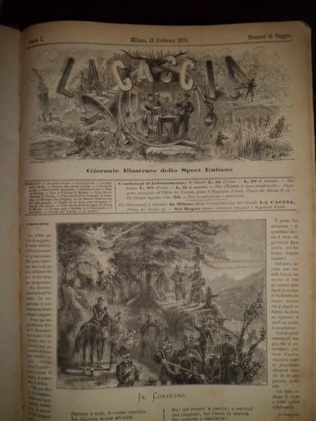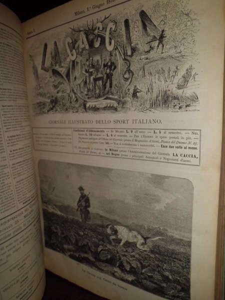 DAL NUMERO DI SAGGIO (12 FEBBRAIO 1876) AL NUMERO 91 (15 DICEMBRE 1879). 4 VOLUMI IN - FOLIO LEGATI ASSIEME IN TELA CON ANGOLI IN PELLE. COMPLESSIVE 749 PP. CON INNUMEREVOLI ILLUSTRAZIONI, ANCHE A PIENA PAGINA, DI SCENE VENATORIE, SELVAGGINA, UCCELLI, CANI, PESCA, CAVALLI, ARMI, E TANT' ALTRO. RACCOLTA PROBABILMENTE COMPLETA DI QUESTO MAGNIFICO PERIODICO BIMESTRALE A NUMERAZIONE CONTINUA. LA SUA RARITÀ È ECCEZIONALE: MANCA ALLA BIBLIOGRAFIA DEL CERESOLI. ESEMPLARE BEN CONSERVATO.