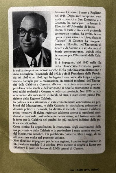 Antonio Guarasci (1918-1974) was an iconic figure of the Calabrian schooling system, culture and politics in the late twentieth century. As a teacher of Philosophy and History in the immediate post-war period, he experimented in teaching the progressive pedagogy of Dewey, who he met in the years of his imprisonment in the USA. As a professor, he directed his research on the history of modern and contemporary Calabria, participating in the renewal of contemporary Italian historiography. As a politician, he conceived his political activity in its original sense of service to the community, in accordance with the principles of social Catholicism. For all the activities carried out in his life, Guarasci’s legacy consists in his political and ideal heritage, that is duty of every Calabrian person to know and promote for the good of the entire community.