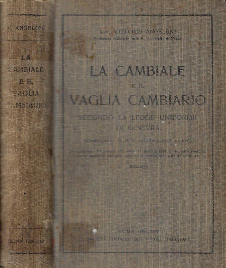 Ristampa con, in appendice, commento alla legge 15 gennaio 1934, n. 48, sulla cambiale tratta garantita mediante cessione di credito derivante da forniture. Legatura segnata dal tempo, con piccolissimi schizzi di vernice bianca in copertina, aloni di precedente scotch e con strappi alle cerniere. Pagine ingiallite, con bordi arrotondati e con sottolineature a pastello rosso e blu. Numero pagine 586.