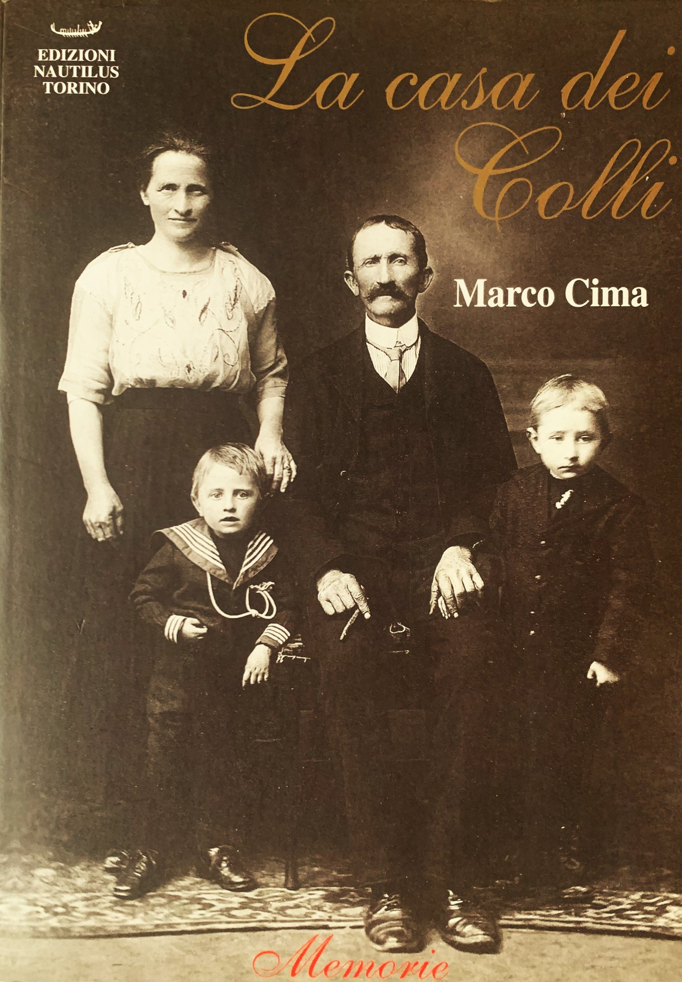 I ed., collezione "Memorie". "Una storia per essere scritta vuole una ragione. La ragione di questa si trova al di là dell'Atlantico, dove rami importanti e folti dell'albero dei Colli hanno contribuito all'eterogeneità della società americana. / Un viaggio, costellato da numerosi family day, mi ha convinto di essere probabilmente l'unico in grado di raccogliere i frammenti di una storia familiare e di ordinarli, in modo da renderli patrimonio comune (. . .). / La storia si dipana tra il racconto di testimoni oculari e pochi documenti (. . .). / I fatti riportati sono tutti accaduti e i personaggi, salvo quelli marginali, sono realmente esistiti. Per ragioni di riservatezza la maggior parte dei nomi sono stati cambiati" (dalla Presentazione dell'A., p. 5). In-8, pp. 416, brossura illustrata in b/n virata seppia (primo piatto: Giovanni Battista Colli (Titta) con la moglie Maddalena Gerbaglio e i due figli Domenico e Grato, in una fotografia del 1922, scattata nello studio fotografico E. Ferro di Cuorgné - ultimo piatto: come sfondo la riproduzione di un documento). Stato buono (dedica a pennarello nero all'occhiello) Indice: Ringraziamenti - Presentazione; Marco Cima (2 settembre 1990) - Capitoli I-XL - illustrazioni (un albero genealogico in nero dei Colli, 5 riproduzioni fotografiche in b/n e due carte in nero) - Note.