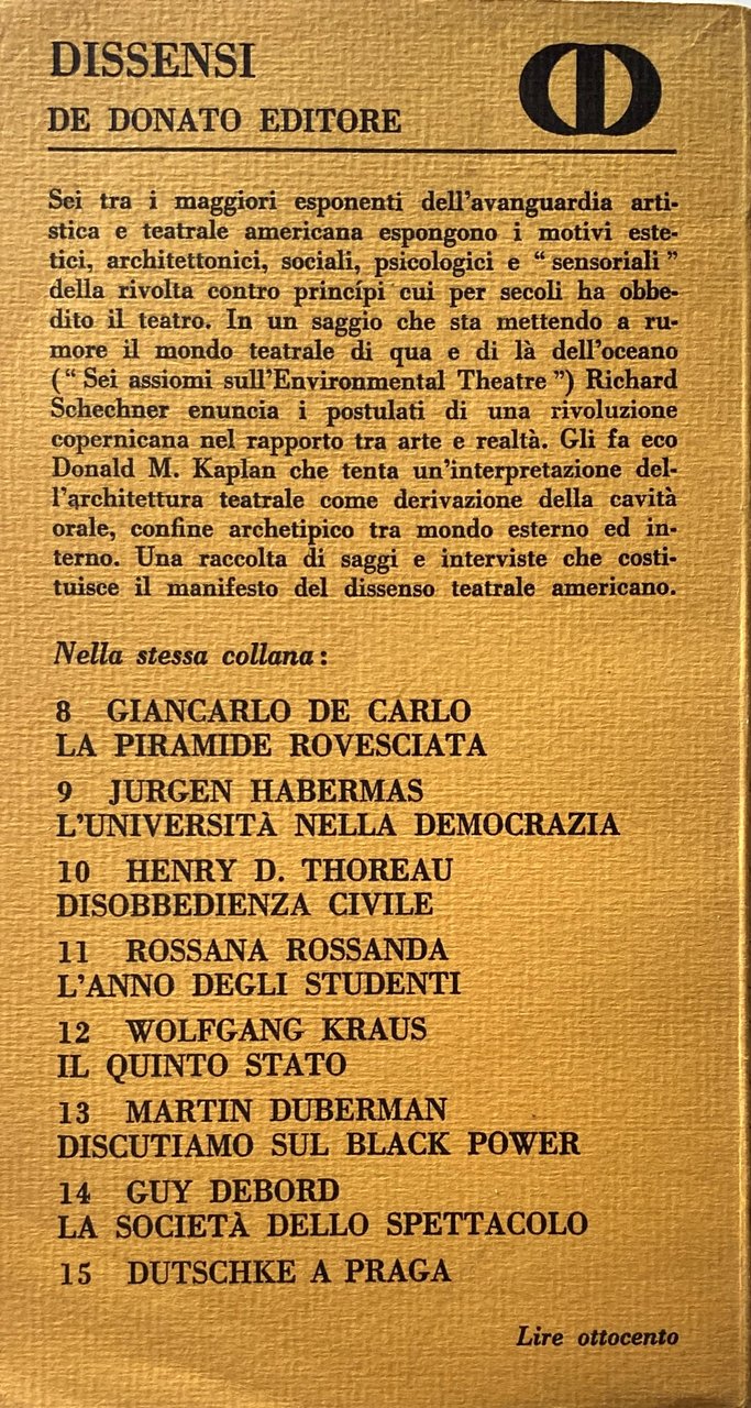 Sei tra i maggiori esponenti dell'avanguardia artistica e teatrale americana espongono i motivi estetici, architettonici, sociali, psicologici e sensoriali della rivolta contro princípi cui per secoli ha obbedito il teatro. In un saggio che sta mettendo a rumore il mondo teatrale di qua e di là dell'oceano (Sei assiomi sull'Environmental Theatre) Richard Schechner enuncia i postulati di una rivoluzione copernicana nel rapporto tra arte e realtà. Gli fa eco Donald M. Kaplan che tenta un'interpretazione dell'architettura teatrale come derivazione della cavità orale, confine archetipico tra mondo esterno ed interno. Una raccolta di saggi e interviste che costituisce il manifesto del dissenso teatrale americano.