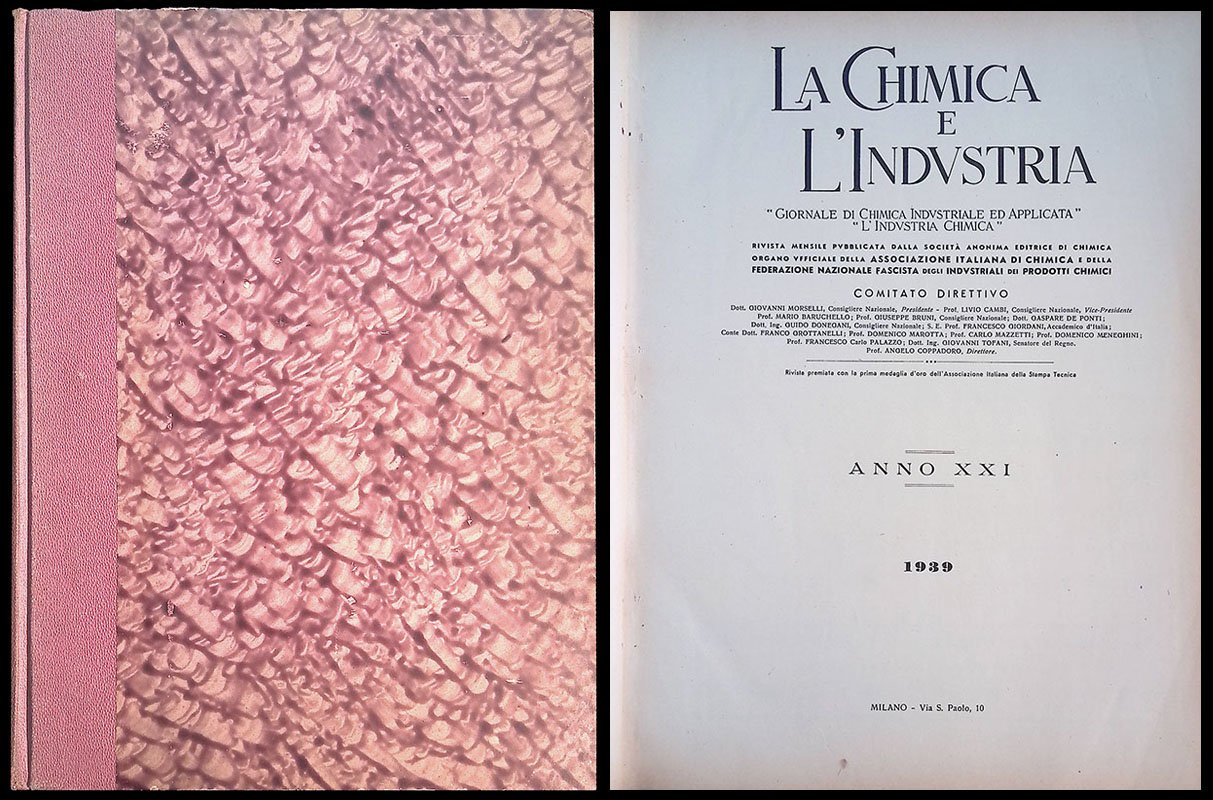 Rivista mensile pubblicata dalla società anonima editrice di chimica organo ufficiale della Associazione Italiana di Chimica e della Federazione Nazionale Fascista degli Industriali dei Prodotti Chimici; Anno XXI (1939), numeri dall'uno al sei. F.to cm 29,5x22,5, copertina rigida, rilegatura coeva, illustrazioni in b/n. Buone condizioni, pagine ottime.