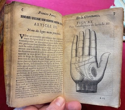16mo (cm. 14,6), 8 cc.nn., 78 pp. (con 6 illustrazioni calcografiche a piena pagina raffiguranti mani chiromantiche (di cui la prima abilmente supplita in facsimile). Legatura coeva in pergamena floscia (scurita, con tracce d’uso e piccole mancanze). Due carte che comprendono anche due illustrazioni restaurate con nastro adesivo senza alcuna mancanza. Lievi aloni diffusi. Nel complesso, fatti salvi i difetti segnalati, esemplare in buono stato di conservazione. Cfr. Caillet (n. 9577): ‘L’un des meilleurs traités de chiromancie qui existent, orné de nombreuses figures finement gravées. Les rapports de l’astrologie avec les temperaments y sont longuement etudies et permettent d’obtenir des resultats plus surs qu’avec les autres methodes’. Cfr. anche Cantamessa (Biblioastrology n. 6828), Bibliotheca Esoterica (n. 4222) e Bibliotheca Magica Casanatense (n. 1072).