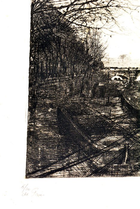 Dimensions: 33,5(20,5)x50,5(37,5) Cm. Gravure sur cuivre en très bon état. Les bords des marges un peu usés. Rousseurs. Très belle gravue d'une vue du bord de la Seine à Paris. La gravure est signée par l'artiste et numeroté 5/20. Cette magnifique gravure nous exprime quelque chose de "très Paris" ! -Comme si on y était….