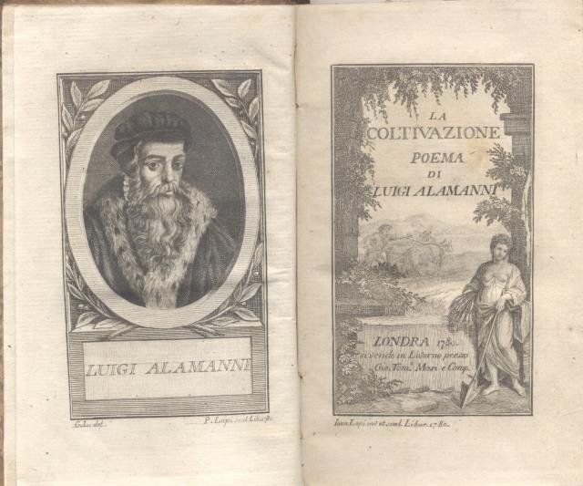 Opera dedicata al Conte Alessio Orlow. Cm.15,5x9,4. Pg.XXXXIV, 238. Legatura in mz.pelle con piatti marmorizzati. Tassello con titoli e filetti in oro al dorso. Il testo è preceduto da una "Vita dell'Alamanni". In fine, con numerazione consecutiva, "Epigrammi toscani di Luigi Alamanni, dal medesimo dedicati alla Serenissima Madama Margarita, Principessa di Francia". All'antiporta ritratto dell'Alamanni inciso da Pompeo Lapi su disegno di Giovanni Lapi. A quest'ultimo si deve anche la gradevole illustrazione a piena pagina del frontespizio. "La Coltivazione" è un poema didascalico in endecasillabi sciolti, in sei libri, derivato dalle "Georgiche" e dagli antichi teorici dell'agricoltura, quali Columella, Palladio, Varrone, Esiodo e altri. Nei primi quattro libri sono descritte le opere rurali delle quattro stagioni, negli ultimi due la coltura degli orti. > "Mostra dell'editoria livornese (1643-1900)", 68. Lastri, 2; e Gamba, 17-20, citano altre edizioni. Codice libreria 115106.