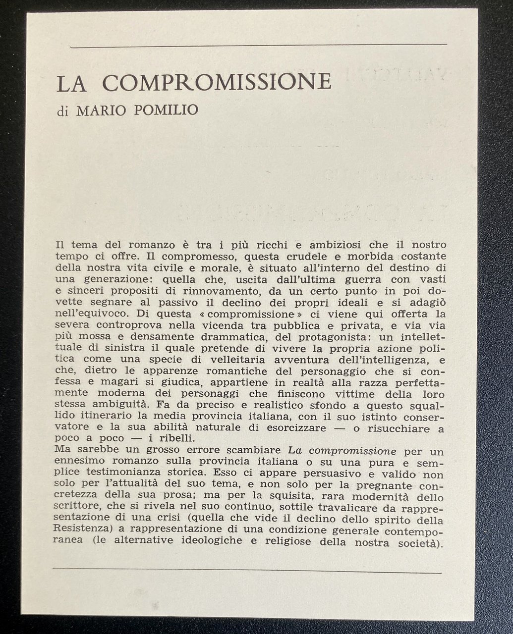 Tra le tante proposte scaturite dall'odierno dibattito attorno al romanzo, quella del romanzo-saggio è certamente una delle più suggestive, anche se delle più rischiose. In questa direzione si colloca con consapevole coraggio questo nuovo romanzo di Mario Pomilio: e del resto, la complessità dei suoi interessi di scrittore (testimoniati anche da una serie di interventi critici di notevole rilievo), l'attenzione con cui, di libro in libro, egli aveva approfondito una sua personalissima problematica morale, e infine la sua capacità di servirsi di strumenti di sondaggio e ricerca di alta qualità narrativa, ci appaiono oggi come i precedenti, necessari, de La compromissione, la sua opera senza dubbio più felice e matura. Il tema del romanzo è tra i più ricchi e ambiziosi che il nostro tempo ci offre. Il compromesso, questa crudele e morbida costante della nostra vita civile e morale, è situato all'interno del destino di una generazione: quella che, uscita dall'ultima guerra con vasti e sinceri propositi di rinnovamento, da un certo punto in poi dovette segnare al passivo il declino dei propri ideali e si adagiò nell'equivoco. Di questa compromissione ci viene qui offerta la severa controprova nella vicenda tra pubblica e privata, e via via più mossa e densamente drammatica, del protagonista: un intellettuale di sinistra il quale pretende di vivere la propria azione politica come una specie di velleitaria avventura dell'intelligenza, e che, dietro le apparenze romantiche del personaggio che si confessa e magari si giudica, appartiene in realtà alla razza perfettamente moderna dei personaggi che finiscono vittime della loro stessa ambiguità. Fa da preciso e realistico sfondo a questo squallido itinerario la media provincia italiana, con il suo istinto conservatore e la sua abilità naturale di esorcizzare o risucchiare a poco a poco i ribelli. Ma sarebbe un grosso errore scambiare La compromissione per un ennesimo romanzo sulla provincia italiana o per una pura e semplice testimonianza storica. Esso ci appare persuasivo e valido non solo per l'attualità del suo tema, e non solo per la pregnante concretezza della sua prosa; ma per la squisita, rara modernità dello scrittore, che si rivela nel suo continuo, sottile travalicare dalla rappresentazione di una crisi (quella che vide il declino dello spirito della Resistenza) alla rappresentazione di una condizione generale contemporanea (le alternative ideologiche e religiose della nostra società).