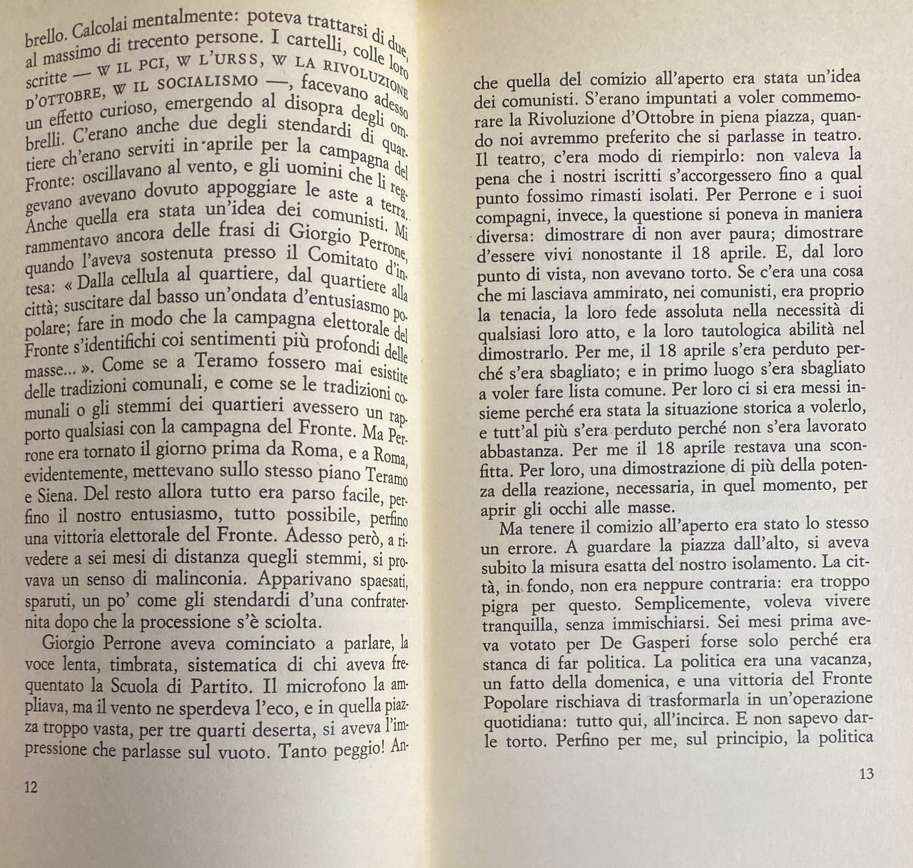 Soggetti: Letteratura italiana Classici Collezionismo Libri fuori catalogo Saggi Provincia Borghesia Romanzi Premio Campiello Anni Sessanta Partito socialista Socialisti Comunisti Elezioni politiche NATO URSS Sinistra Democristiani Potere Cattolici Chiesa Cattolicesimo Democrazia cristiana Cappuccini Matrimonio Idee Ideologie Guerra Fredda Comunismo Compromesso religioso Politica Compagni Partito Messa Fallimento Impegno civile Militanza Militanti Amore Relazioni Distacco amoroso Abruzzo Teramo Ricostruzione postbellica Segretario Sezione locale Sconfitta elettorale 1948 Ideali borghesi Colpa Ritratto Generazione Ideologia Storia collettiva Responsabilità Tradimenti politici Narrativa contemporanea Problemi Coscienza religiosa civile sociale Morale Critica Addio Marxismo Boulogne Bruxelles Bunker Carlo Alianello Coccioli Cimitero Compromissione Coolies Donna Saviane Gita Giuseppe Berto Inge L'uccello nella cupola Luigi Compagnone Milena Milani Morte Piero Bargellini Sentimento Sigaretta Silenzio Tabernacolo Vent'anni Scrittori italiani Amelia Arrigo Avezzano Caffè Centrale Comizi Compagno Berardi Fascismo Fausto Giacinto Spagnoletti Giancarlo Vigorelli Giorgio Perrone Gran Sasso l'Avanti Notaresco Padre Passato Patto Atlantico Paura Ragazza Realtà Sentimenti Storia Teramo Tordino Crisi Marco Berardi Amelia De Ritis Incipit Rivoluzione De Gasperi Osvaldo Pace Autocritica Movimento operaio Lotta di classe Fede Topolino Famiglia Società Intellettuali Italian literature Classics Collectibles Out of print books Essays Province Bourgeoisie Novels Sixties Socialist Party Communists Political elections Left Catholics Church Catholicism Christian democracy Marriage Ideologies Cold War Communism Religious compromise Politics Failure Militancy Love Relationships Loving detachment Defeat Bourgeois ideals Guilt Portraits Generation Ideology Collective history Political betrayals Contemporary fiction Romanzo storico Storici