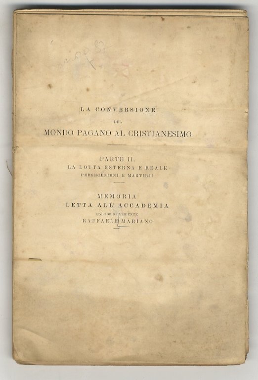 La conversione del mondo pagano al Cristianesimo. Parte II: la lotta esterna e reale, persecuzioni e mertiri. Memoria letta all'Accademia da socio residente Raffaele Mariano.
