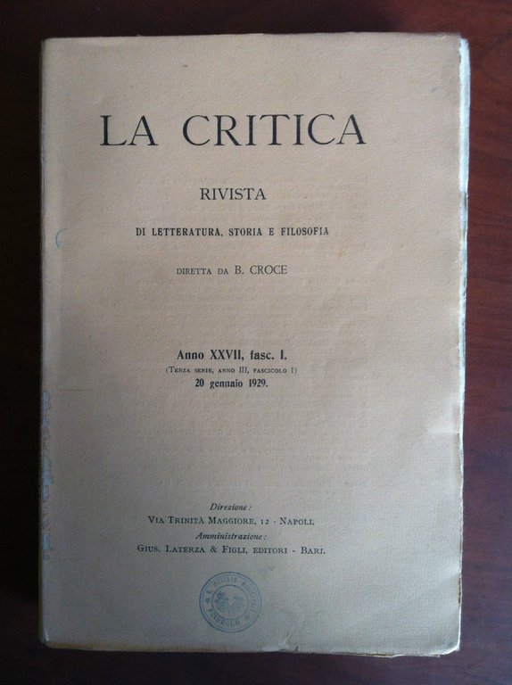 La critica Anno XXVII fasc I - 20 Gennaio 1929 diretta Benedetto Croce- E19660