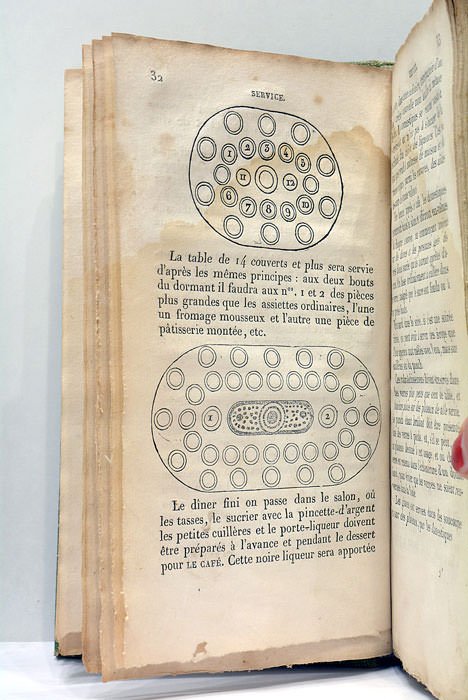 Manque la page de titre. 424 pages. Page 5 - page 20 d'un catalogue de libraire à la fin du livre. (19x11 Cm). Reliure toile postérieure. Titre imprimé au dos. Coins et coiffes légérement émoussés. Déchirures sur les deux 1ère pages. Importantes mouillures et rousseurs. Plis et traces de plis. Notre exemplaire manque malheureusement la page de titre et une partie du catalogue de libraire à la fin du livre. Ce livre très divers sur l'art de la table et les préparations de plats contient de nombreuses recettes et les meilleurs mets anglais, avec 37 figures dans le texte, dont 2 coloriées.
