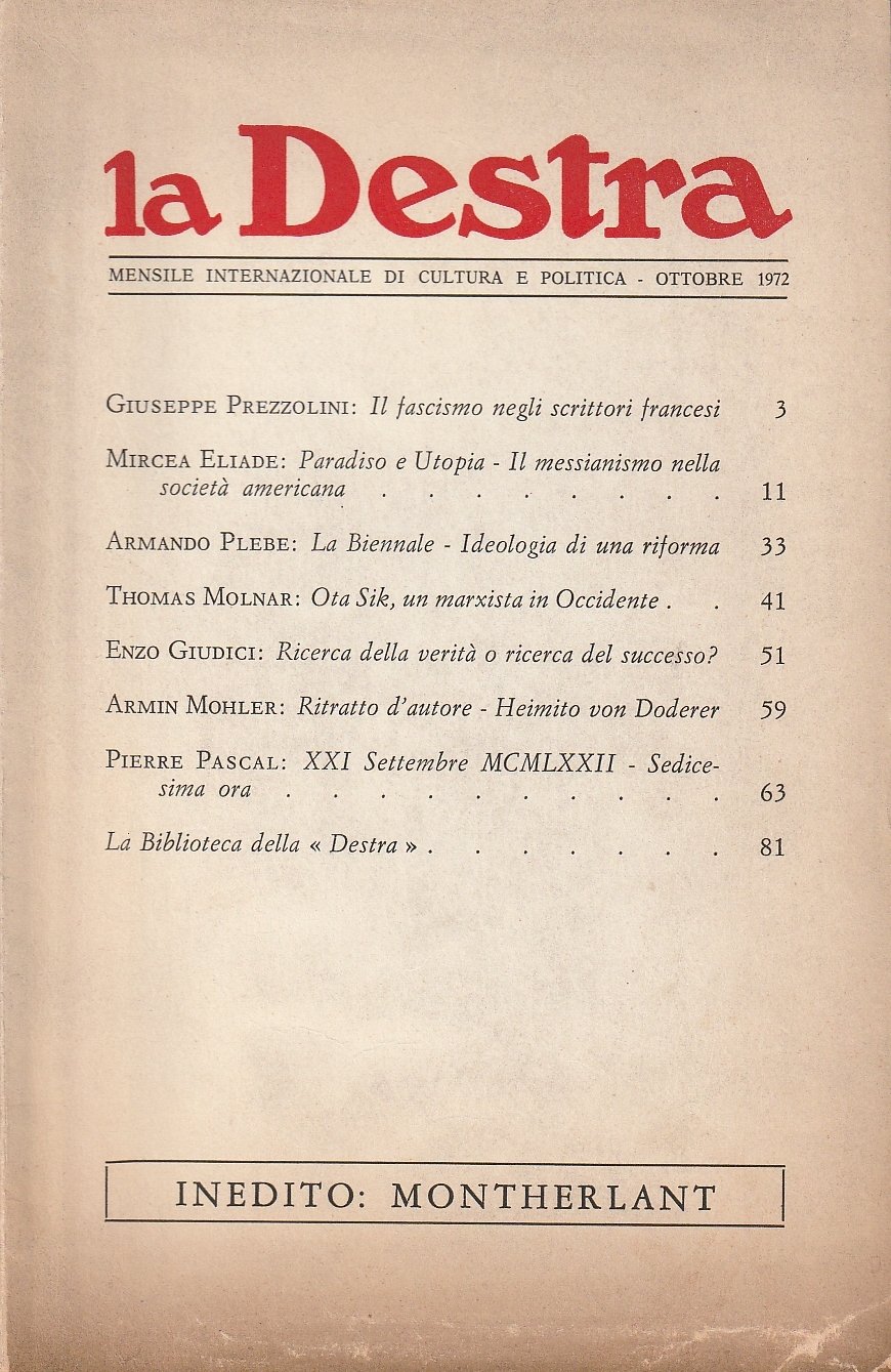 La Destra. Mensile internazionale di cultura e politica. Anno II No. 10. Ottobre 1972