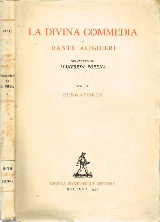 Opera incompleta, dei tre volumi di cui è composta presente Vol. II: Purgatorio. Stato discreto, coperta in carta, usura da scaffale, macchie, tracce di fioritura sparsa, tagli, con barbe, e margini dlele pagine leggermente ambrati, pagine, sottili, in buono stato. Marginalia. Illustrazioni in nero. Commentata da Manfredi Porena. Numero Pagine 339