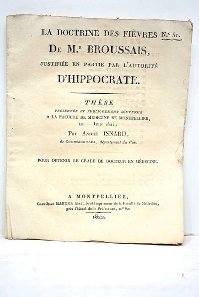 La doctrine des fièvres de Mr. Broussais justifiée en partie par l'autoritée d'Hippocrate. Thèse présentée et publiquement soutenue à la Faculté de Médecine de Montpellier, le juin 1822.