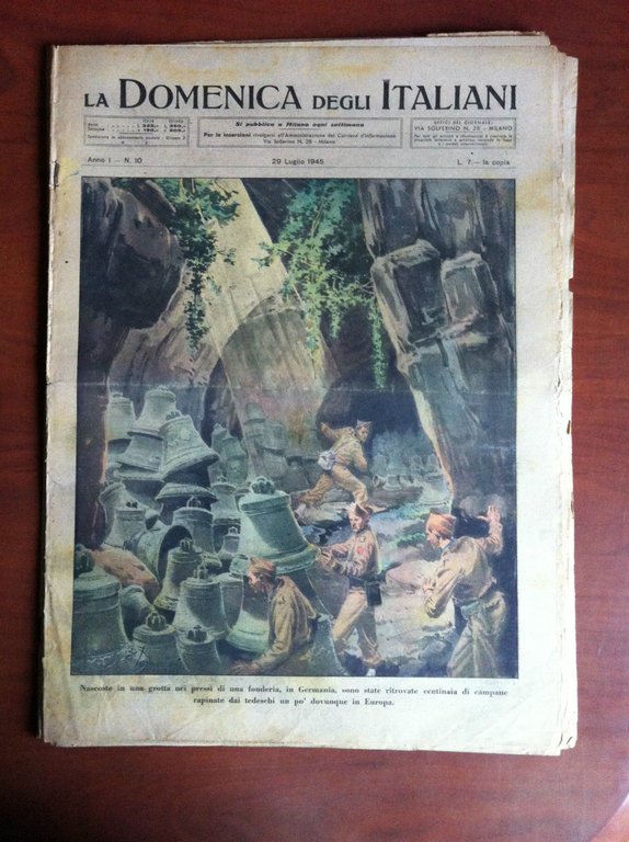 La Domenica degli ItalianiDopo la caduta del regime fascista il giornale cambia testata per poi ritornare all'originaleDOMENICA DEL CORRIEREIllustrazioni copertina e 4^ di copertinaCampane rapinate in europa dai tedeschi ritrovate in una grotta in GermaniaCastello Sforzesco di MilanoIn buono stato salvo ritaglio di circa 9x9 cm in quarta di copertina (30 g)E8104