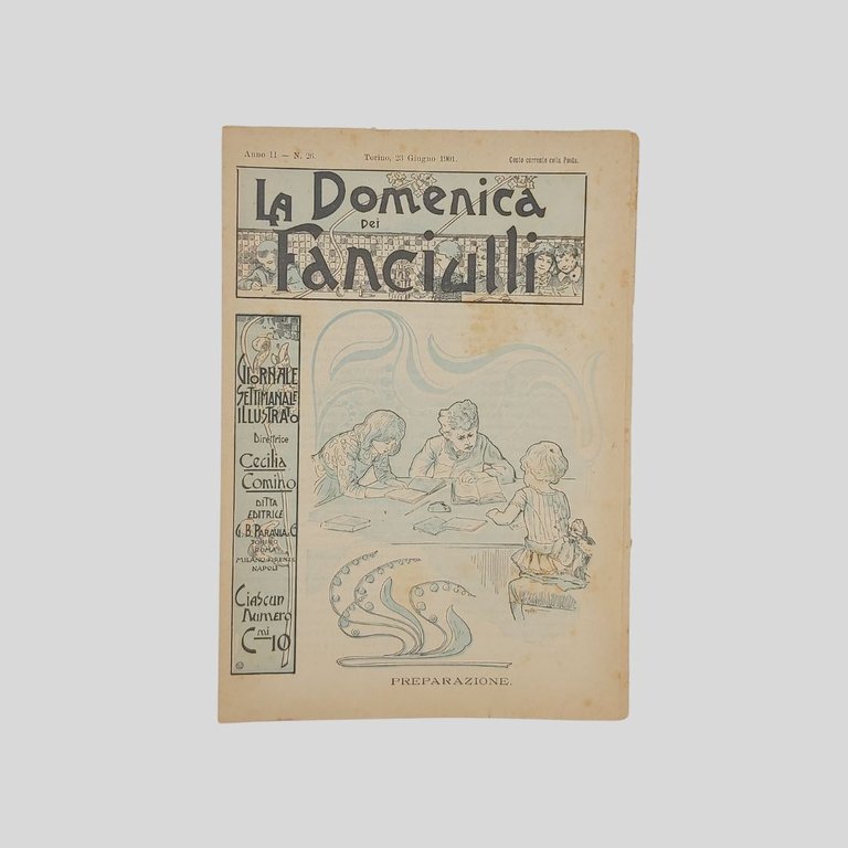 anno II, n. 26, 23 giugno 1901, cm 27×19, pp. 16 (numeraz. continua). Dir. Cecilia Comino. Illustrazioni in bianco e nero e a colori, nel testo e fuori testo e pagine di pubblicità. Testata di GIB. Cop. a colori. Lievi fioriture alla cop. Non comune come tutti i fascicoli del primo e secondo anno. La domenica dei Fanciulli con la testata dalla grafica di gusto liberty e con le innovative copertine costituì uno dei più felici esempi dell’Art Nouveau. Esso dirà ai più piccoli, come ai più grandicelli, tante cosette utili a sapersi ritrarrà scene della vostra vita quotidiana in casa ed in iscuola; vi proporrà giuochi istruttivi, lavoretti geniali; vi narrerà graziose storielle; vi presenterà, come in una lanterna magica, quadri curiosi ed attraenti sui più svariati soggetti. Con l’inizio del ‘900 si vedono ridursi sempre di più le distanze tra artisti e illustratori e avviarsi una capillare diffusione delle riviste stampate con moderni procedimenti fotolitografici. È il caso del settimanale La domenica dei fanciulli, pubblicato a Torino dal 1900 al 1920, un nuovo “giornale settimanale illustrato” per bambini che andava ad affiancarsi ad altre prestigiose testate come Il Giornalino della domenica e Il Corriere dei piccoli e che proseguì le pubblicazioni per un ventennio. Edita da Paravia, fu diretta prima da Cecilia Comino e poi da Luisa Arietti. Tra i collaboratori: Teresa Corrado, T. Gironi, L. Sclaverano, E. Nuccio. Tra gli illustratori: Attilio (Attilio Mussino), Adalbert Begas, Gaido e Giulio Brugo, G. G. Bruno, F. Calmettes, Carlucci, Quinto Cenni, Gech (G. E. Chiarino), Zier (R. de La Neziére), Ch. Parc, L. Pansa.