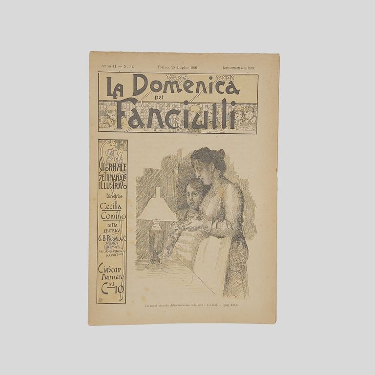 anno II, n. 31, 28 luglio 1901, cm 27×19, pp. 16 (numeraz. continua). Dir. Cecilia Comino. Illustrazioni in bianco e nero e a colori, nel testo e fuori testo e pagine di pubblicità. Da questo numero “Il nostro serraglio”, rubrica sugli animali feroci con illustrazione in bianco e nero. Testata di GIB. Cop. a colori. In buone condizioni. Non comune come tutti i fascicoli del primo e secondo anno. La domenica dei Fanciulli con la testata dalla grafica di gusto liberty e con le innovative copertine costituì uno dei più felici esempi dell’Art Nouveau. Esso dirà ai più piccoli, come ai più grandicelli, tante cosette utili a sapersi ritrarrà scene della vostra vita quotidiana in casa ed in iscuola; vi proporrà giuochi istruttivi, lavoretti geniali; vi narrerà graziose storielle; vi presenterà, come in una lanterna magica, quadri curiosi ed attraenti sui più svariati soggetti. Con l’inizio del ‘900 si vedono ridursi sempre di più le distanze tra artisti e illustratori e avviarsi una capillare diffusione delle riviste stampate con moderni procedimenti fotolitografici. È il caso del settimanale La domenica dei fanciulli, pubblicato a Torino dal 1900 al 1920, un nuovo “giornale settimanale illustrato” per bambini che andava ad affiancarsi ad altre prestigiose testate come Il Giornalino della domenica e Il Corriere dei piccoli e che proseguì le pubblicazioni per un ventennio. Edita da Paravia, fu diretta prima da Cecilia Comino e poi da Luisa Arietti. Tra i collaboratori: Teresa Corrado, T. Gironi, L. Sclaverano, E. Nuccio. Tra gli illustratori: Attilio (Attilio Mussino), Adalbert Begas, Gaido e Giulio Brugo, G. G. Bruno, F. Calmettes, Carlucci, Quinto Cenni, Gech (G. E. Chiarino), Zier (R. de La Neziére), Ch. Parc, L. Pansa.