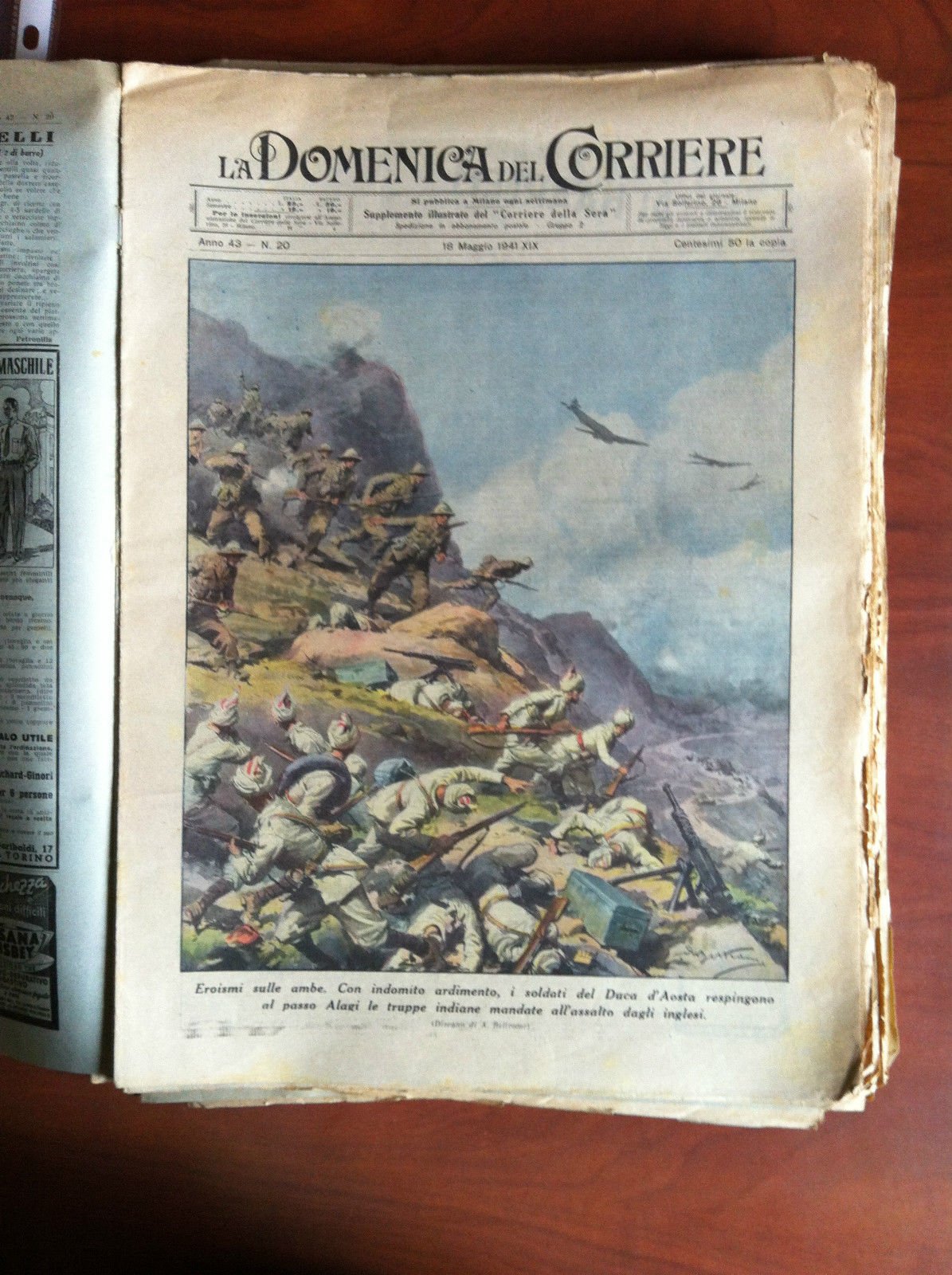 La Domenica del CorriereAll'interno disegni di A. Beltrame: i soldati del Duca d'Aosta respingono le truppe indiane mandate dagli inglesi al passo AlagiIncursione aerea tedesca mette a fuoco Westminster a LondraIn buono stato (50 g)E7464