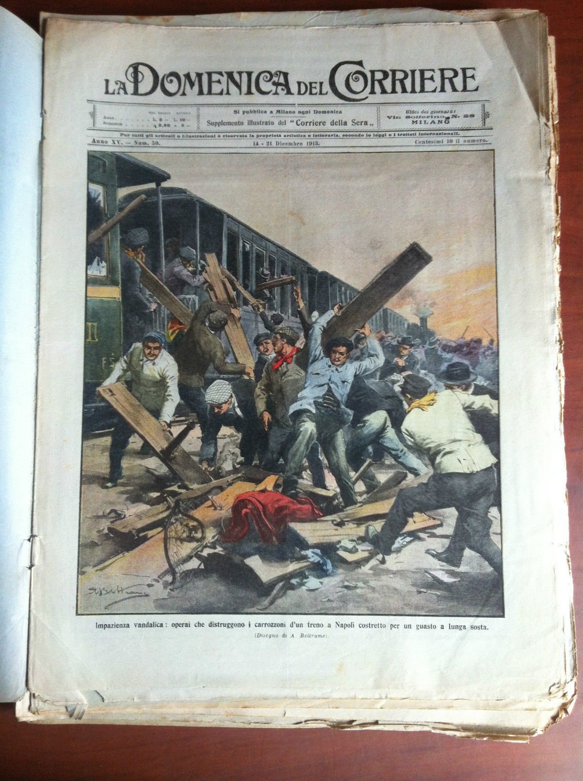 La Domenica del CorriereAll'interno disegno di A. Beltrame:Operai a Napoli distruggono carrozoni di un treno fermo per sostaAix-le-Bains terrore degli operai davanti ad un serpente fuggito da un serraglio(60 g)E9434