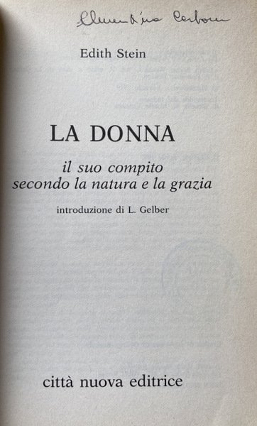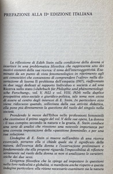 La riflessione di Edith Stein sulla condizione della donna si inserisce in una problematica filosofica che rappresenta uno dei motivi costanti della sua ricerca: il tema dell'intersoggettività. Risalendo alla fonte dei problemi ed esaminandoli nel la loro ampiezza, ella affronta anche la questione teologica, fondamentale per chiarire il comportamento morale; si comprende in tal modo che il ruolo subordinato della donna e la prepotenza dell'uomo sono dovuti alla corruzione della natura umana operata dal peccato originale. Il superamento delle passioni è possibile solo se interviene l'aiuto della grazia divina.