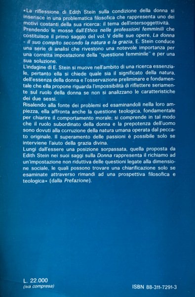 Edith Stein (1891-1942): una delle menti più brillanti e multiformi del panorama filosofico del primo Novecento, una vicenda personale affascinante e complessa. La donna condensa in otto saggi l'originale punto di vista della nota fenomenologa sulla condizione femminile e sulla missione della donna nella società: tesi rivoluzionarie per l'epoca in cui erano enunciate, che mostrano una profonda conoscenza del ruolo della donna nel mondo e fanno emergere una figura a tutto tondo di filosofa, psicologa, educatrice.